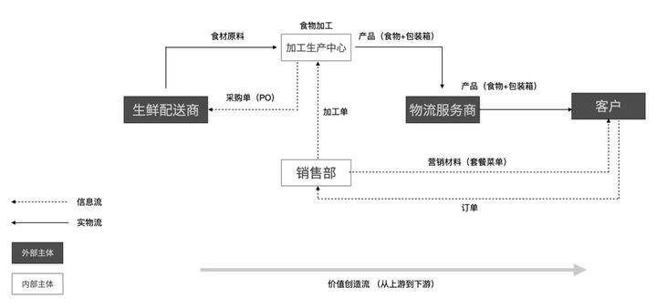 在本例中,客户向普渡餐饮的销售部下订单,销售部据此向内部的加工中心下加工单,加工中心再据加工单向生鲜配送商下采购单。以上是整个业务活动的信息流部分。然后生鲜配送商向加工中心配送食材原料,再被加工成最终产品,并通过物流服务商配送给客户。在这个流程图中,信息流用虚线表达,实物流用实线表达。在后面的信息架构工作中,我们重点要关注的是信息流,以及和信息流相关的角色主体。