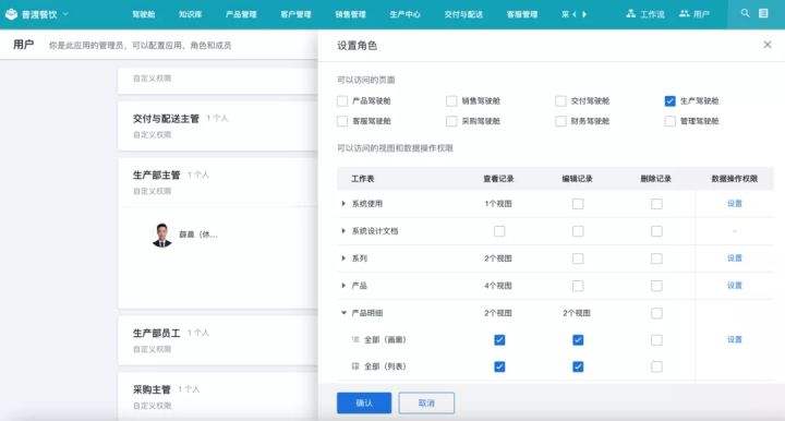 在这个明道云实施专家搭建的应用中,将不同业务环节分组(顶部菜单),在每个业务分组下建立对应的工作表。比如,如图产品管理分组下就建立了系列(分类),产品,产品明细和产品配方这四个对象。