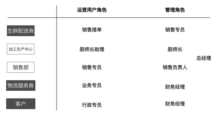 在角色定义中,内部用户一般要精确到特定的职能,而外部角色一般不需要细化,因为上下游协作主体一般都有固定的角色来和本企业进行交互。比如在本例中,无论是物流服务商,还是生鲜配送商,都是由客户服务部门来对接的。