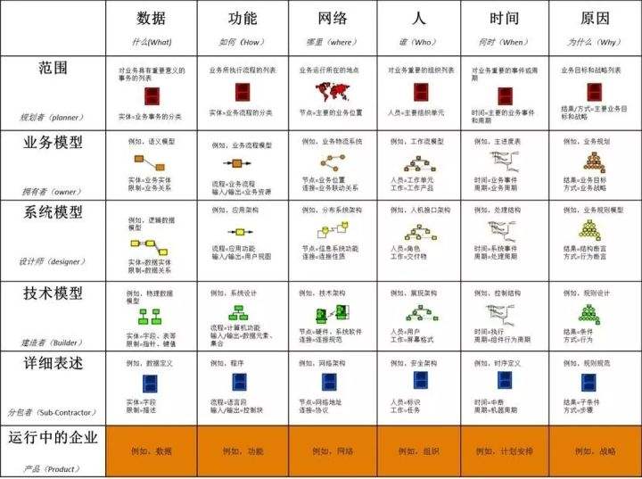 Zachman 框架起源于 John Zachman 先生在 1987 年完成的信息系统架构论文“A framework for information systems architecture”,他把信息系统架构设计相关的各种元素归纳到如下表格之中: