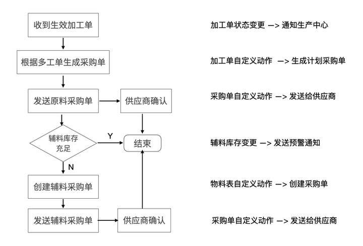 在流程图的右侧,我们可以在对应的位置上起草一些具体的架构内容。比如,根据多工单生成采购单的节点就对应了加工单的自定义动作(工作流的一类)的创建,它的实质是要根据加工单明细来获取物料明细,并将物料明细组合成计划状态下的采购单。而同样,创建辅料采购单则比较简单,它应该直接依附在物料表记录上,针对特定辅料来创建采购单。