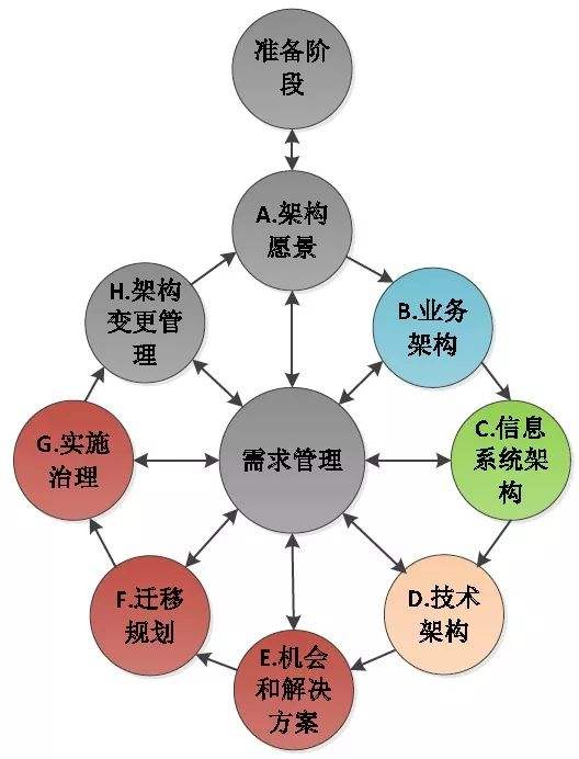 TOGAF 的一大特色在于其独特的架构开发方法 AMD (Architecture Development Method),它是一个以需求为中心的循环过程。在总体框架和规划原则的前提下,ADM 方法从架构愿景出发,经过业务架构规划,确定信息系统架构和技术架构,然后结合现有的信息化基础,给出企业信息化建设,适应性改造的解决方案。迁移计划针对实施方案中不同项目的优先权,评估各个项目的依赖程度、迁移费用、收益等,并形成具体的实施规划;实施治理制定了各个实施项目的建议,建立架构规约来管理所有实施和部署的过程,以确保实施项目架构与相关项目架构的一致性。架构变更管理关注业务目标、环境和技术等方面的演变和发展,为是否启动和规划新的架构进化周期提供。