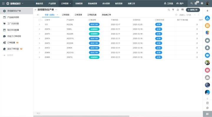 最后,该公司选择了明道云,并搭建出一套覆盖服装生产全流程的系统。它包含产品管理、订单管理、生产管理、采购管理、供应商管理、采购管理、库存管理、财务管理九大板块。