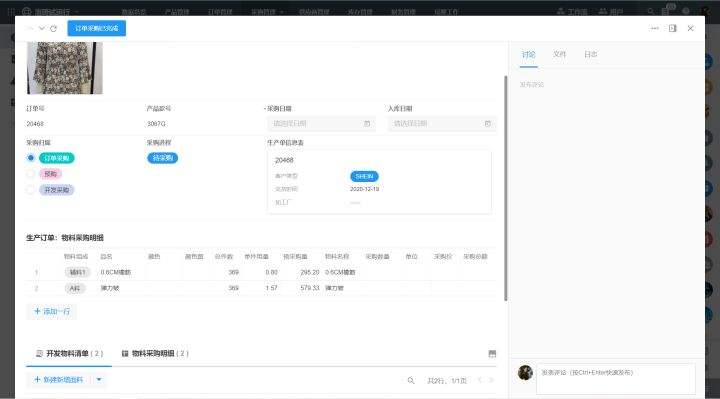 业务员生效订单后,需要提交采购申请;而系统会根据开发物料生成采购明细,并自动写入采购申请单。同时,采购人员自行判断是否沿用之前所购的物料,以便根据实际市场行情更换供应商物料。