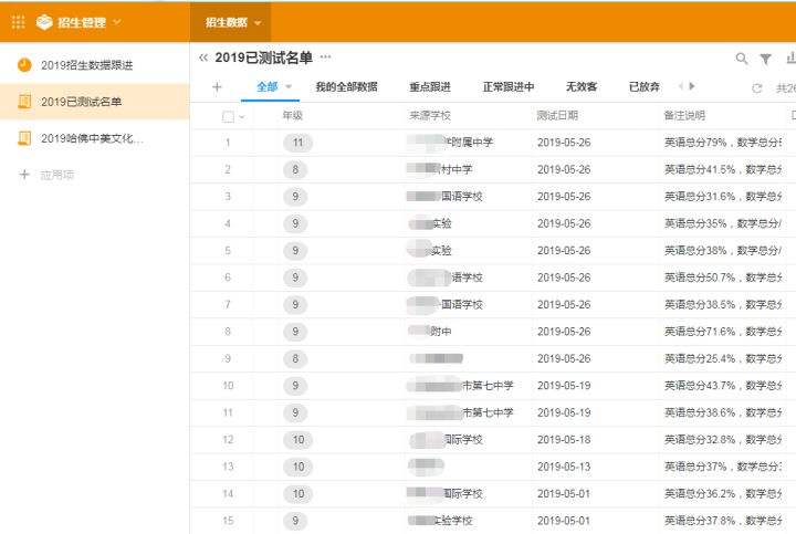 根据每次招生活动的开展,使用明道云应用设置了符合各活动的数据管理表格,可以具体到每位学生的情况,由负责招生、入学测试、后期学生管理的同事共同进行表格的管理。这不仅有利于客户的跟进、每次活动情况的记录,而且有利于招生工作有效的进行,同时确保了数据信息电子化,后期查询工作更容易。