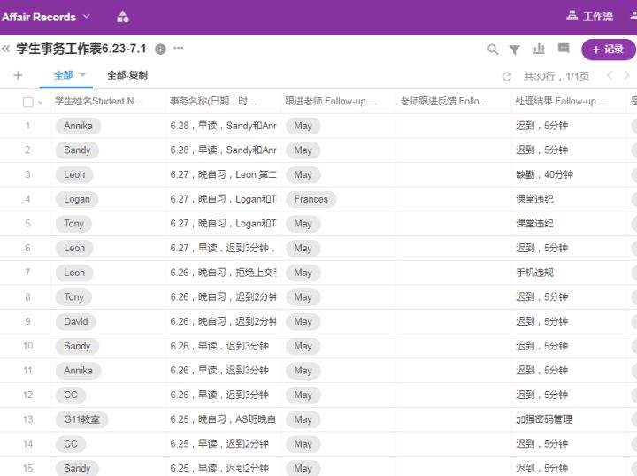 公司使用明道云应用,建立了适合学生管理的学生事务管理系统,通过一系列工作表格,让管理精准到每个学生、每节课堂,不仅可以完善学生管理的记录,还可以让此信息同步给所有的老师,更有利于学生管理工作的开展。