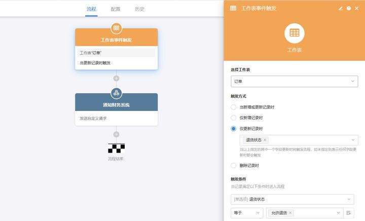 案例场景:某电商公司使用了进销存,APaaS(假设为明道云)和财务软件三套系统,公司的退货流程如下,客户申请退货 => 客服审核 => 仓库确认到货 => 财务退款 => 退货完成,每一次完整的退货流程都需要数据在三个系统中相互流转。