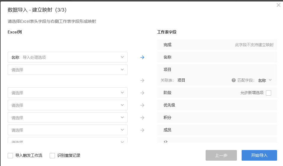 根据需要手动从应用系统导出待处理的数据,再导入另一套应用系统,处理完再导回本应用系统。明道云系统提供比较精细的 Excel 文件导入交互,能够让用户在导入过程中建立字段映射,自动去重,甚至包括在导入过程中建立数据关联。