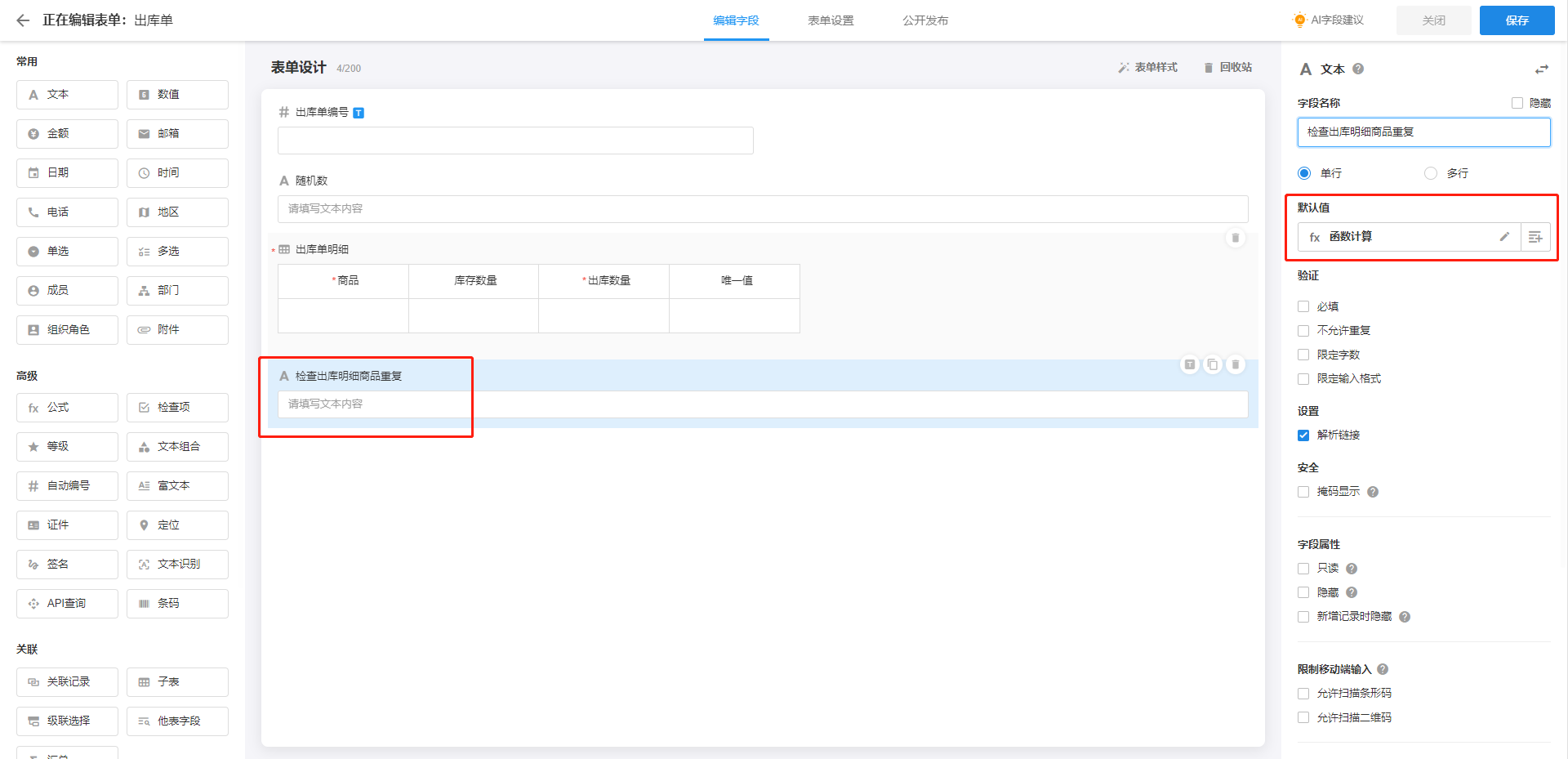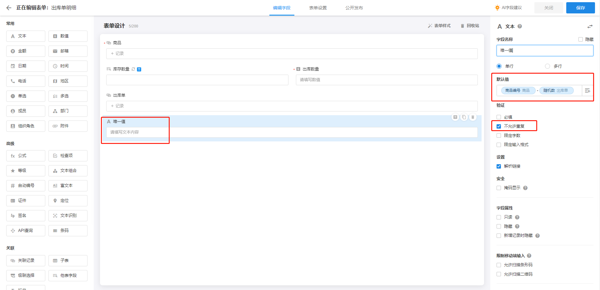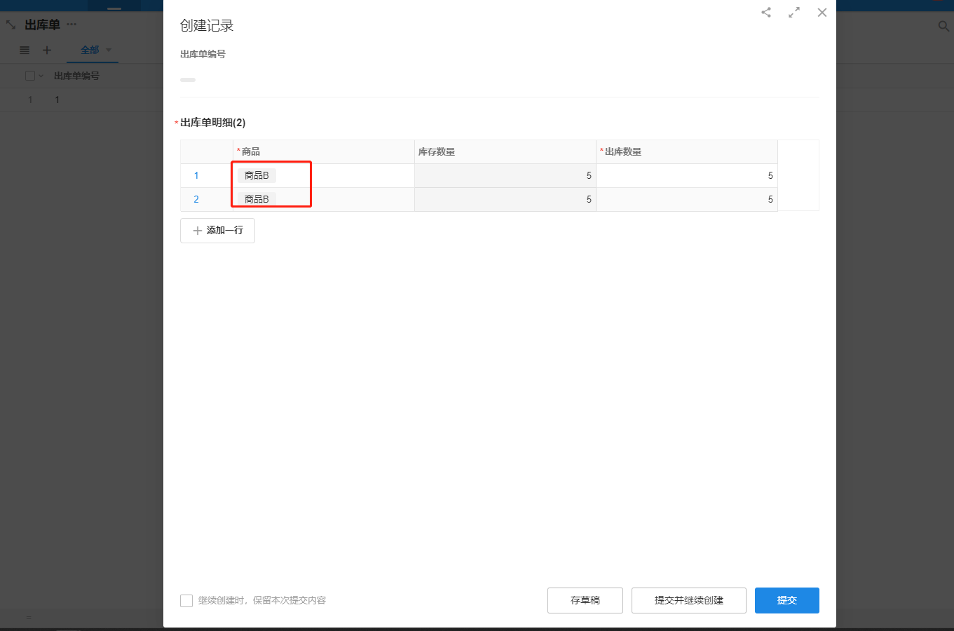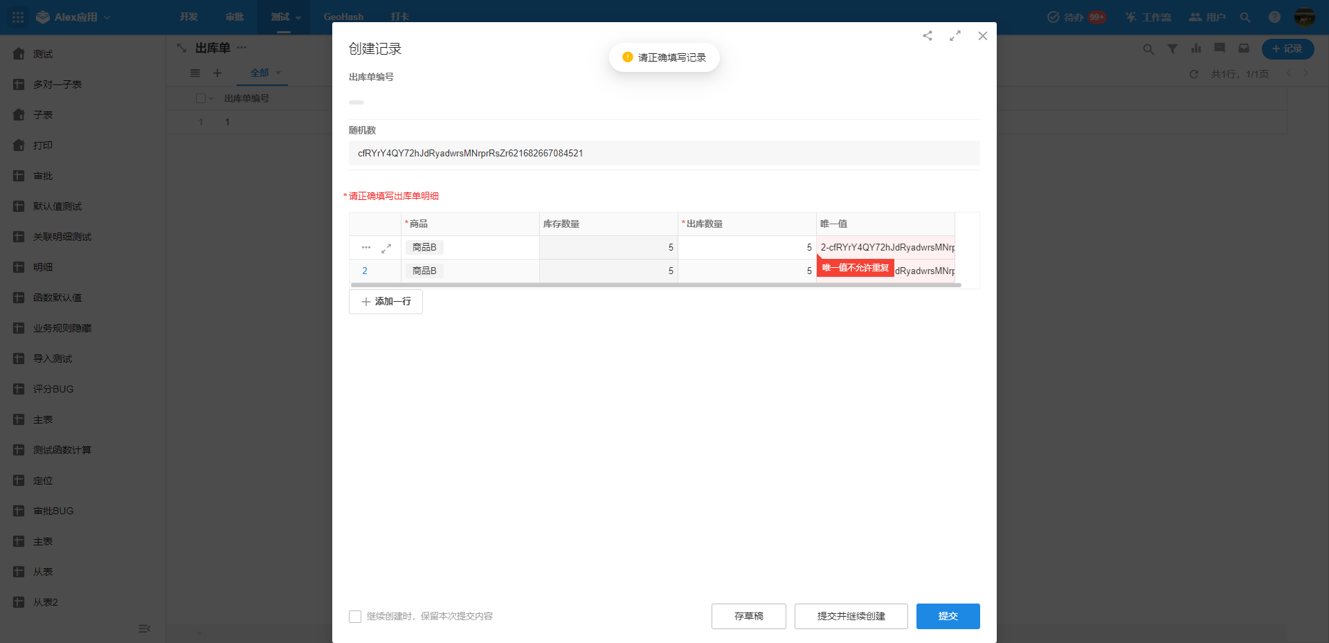 在出库单明细添加字段“唯一值”,其默认值设置为 “商品表的商品编号 + 出库单的随机数”,注意还要设置不允许重复,这是关键一步。