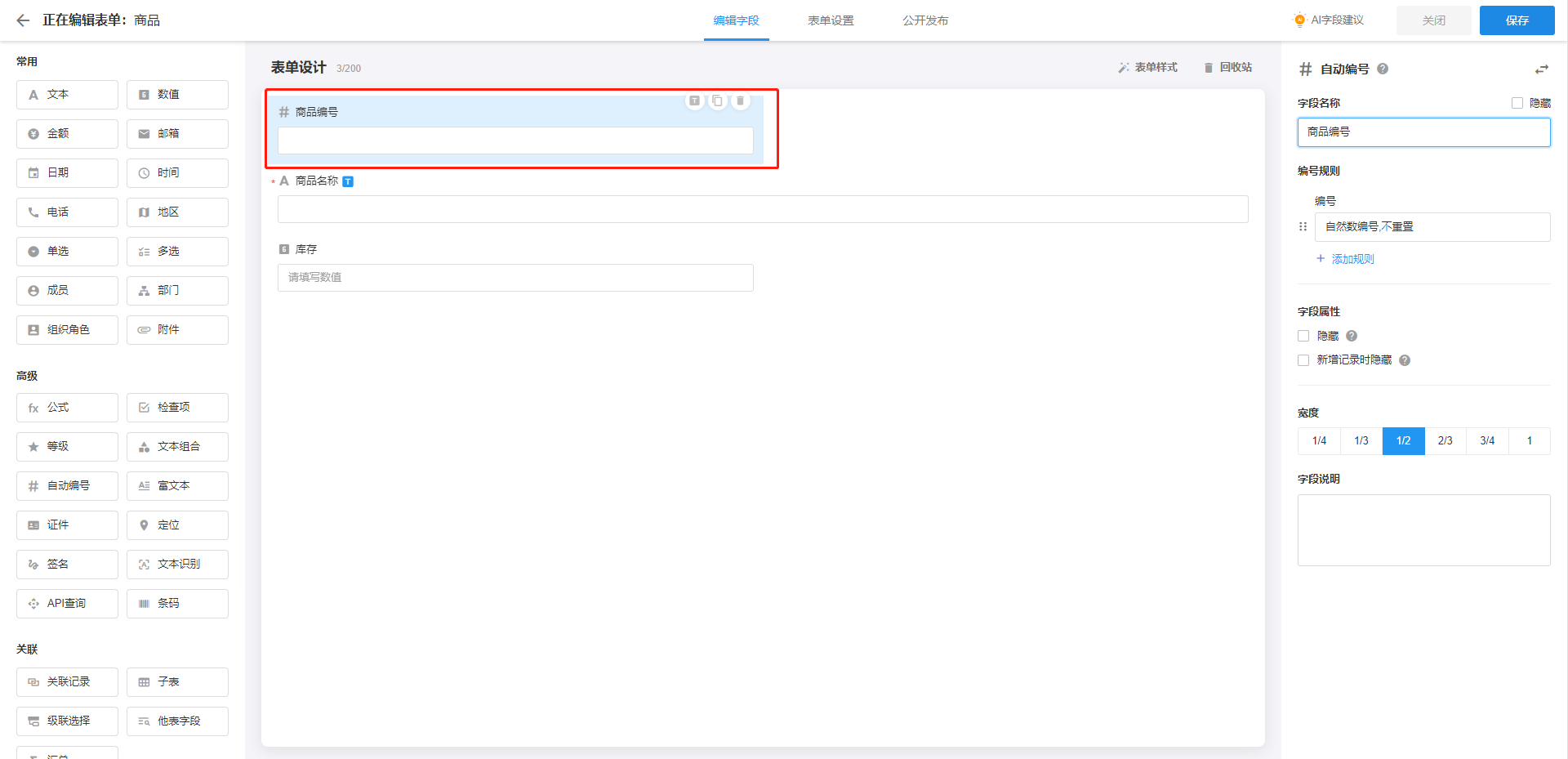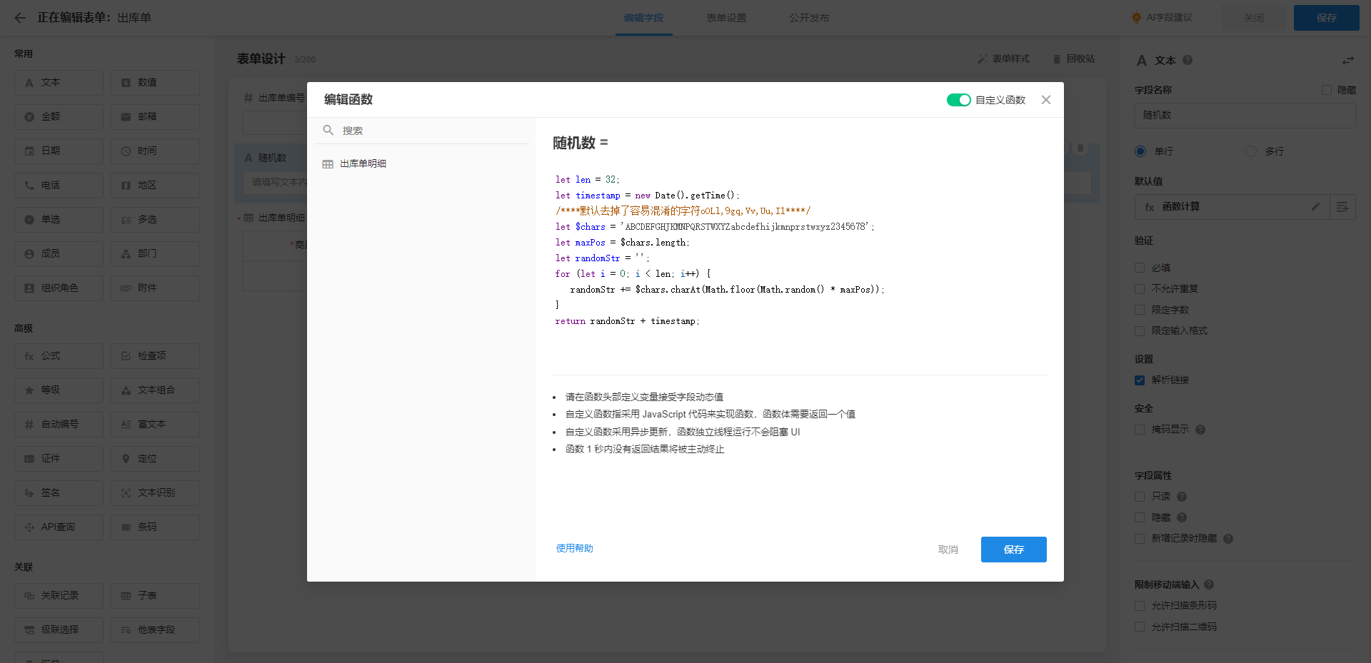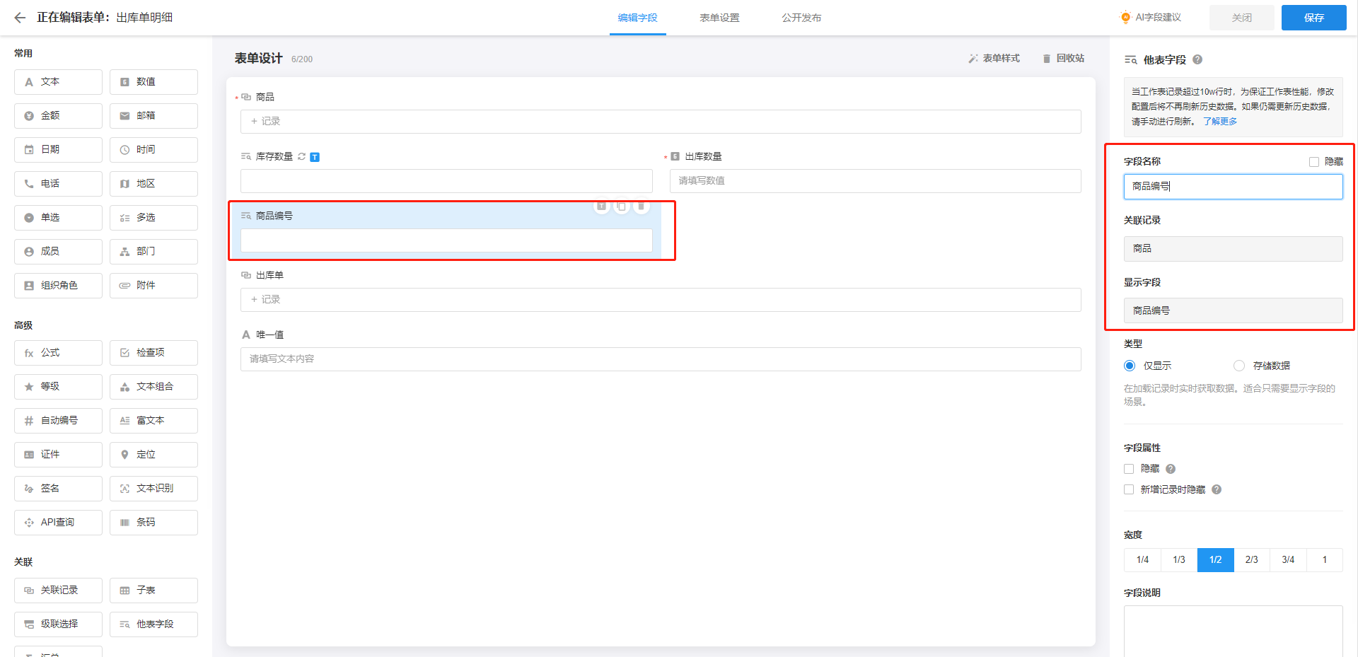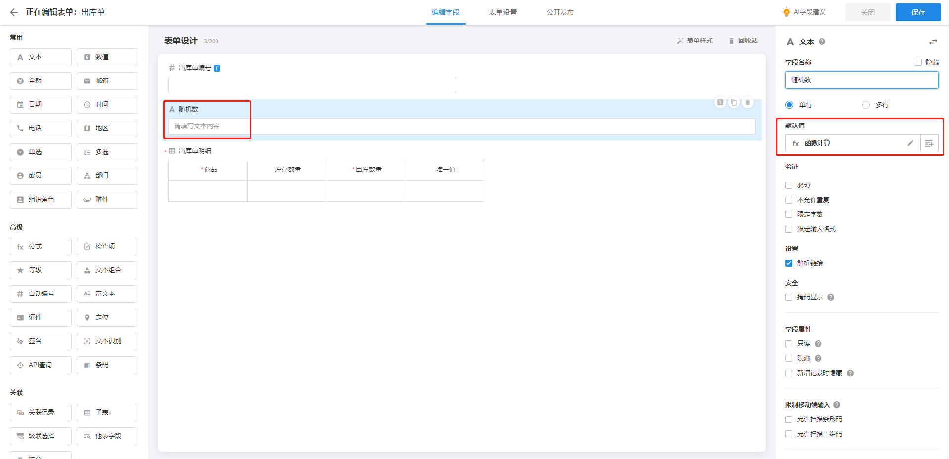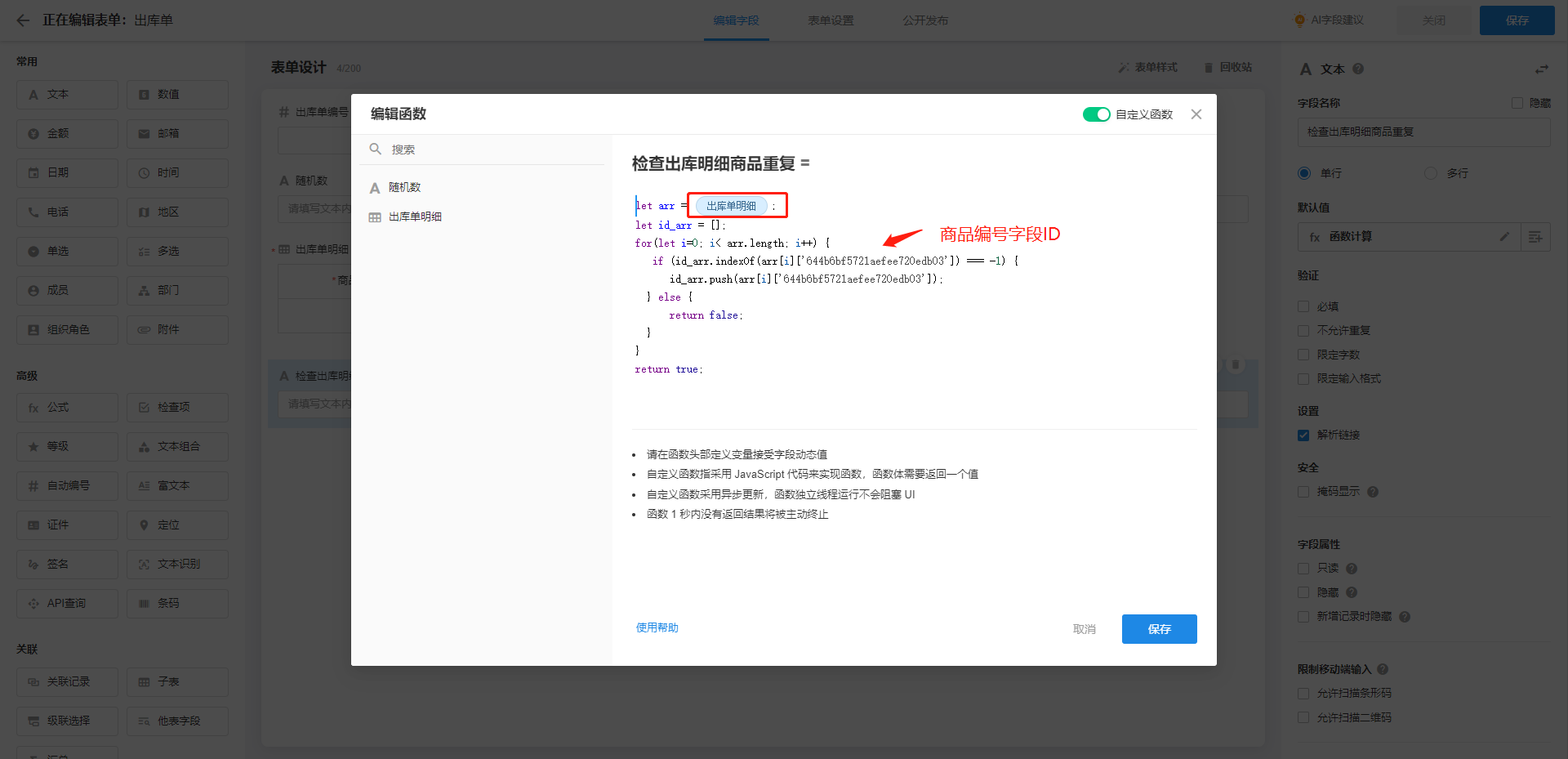 在出库单明细添加字段“唯一值”,其默认值设置为 “商品表的商品编号 + 出库单的随机数”,注意还要设置不允许重复,这是关键一步。