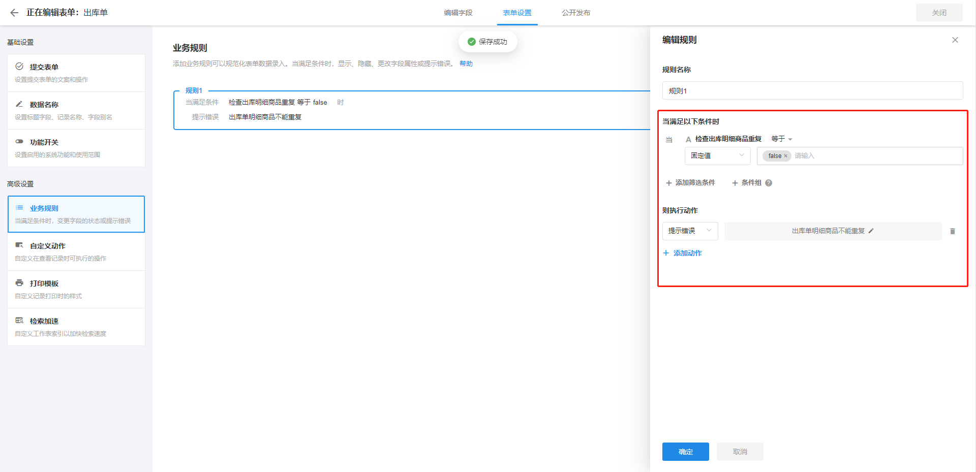 这样再添加重复商品的出库明细时,唯一值会提示不允许重复