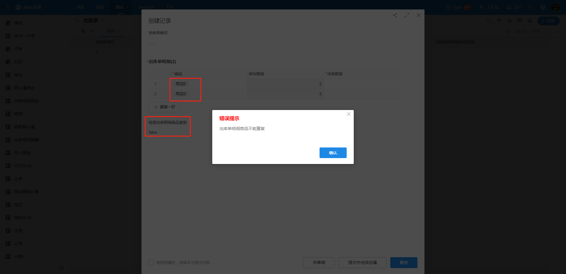 **效果:**添加重复商品的出库明细时,会根据业务规则提示错误