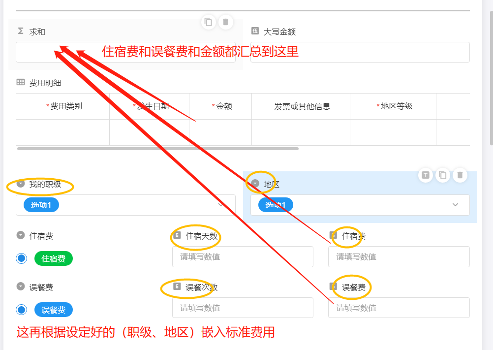 我的主表本身有个费用明细的字表了,如果把这两个费用单独拎出来的话(在主表建立字段:城市、职级、每天住宿费、每天餐费),这两个费用能不能和子表里面的费用一起汇总到求和字段里面?
