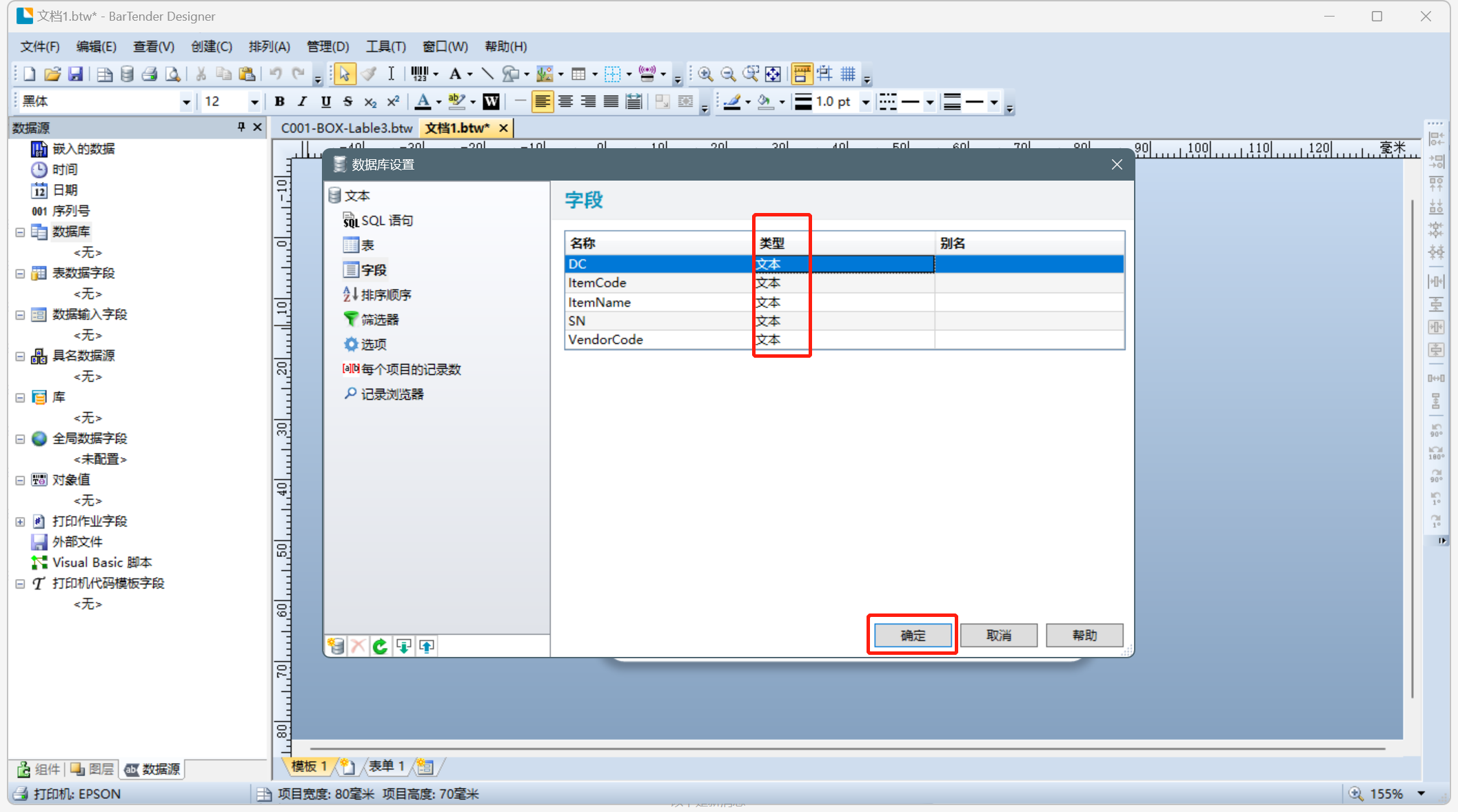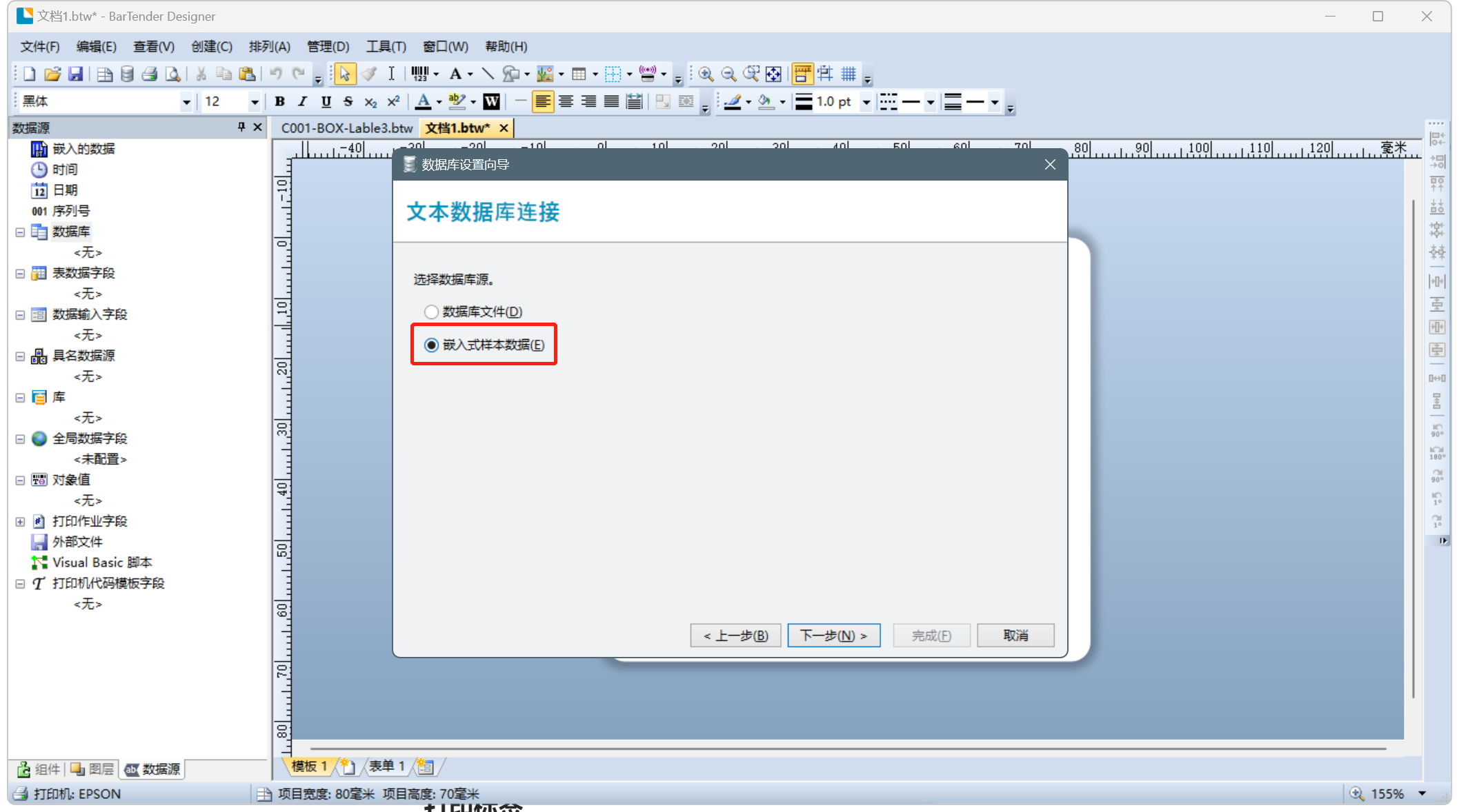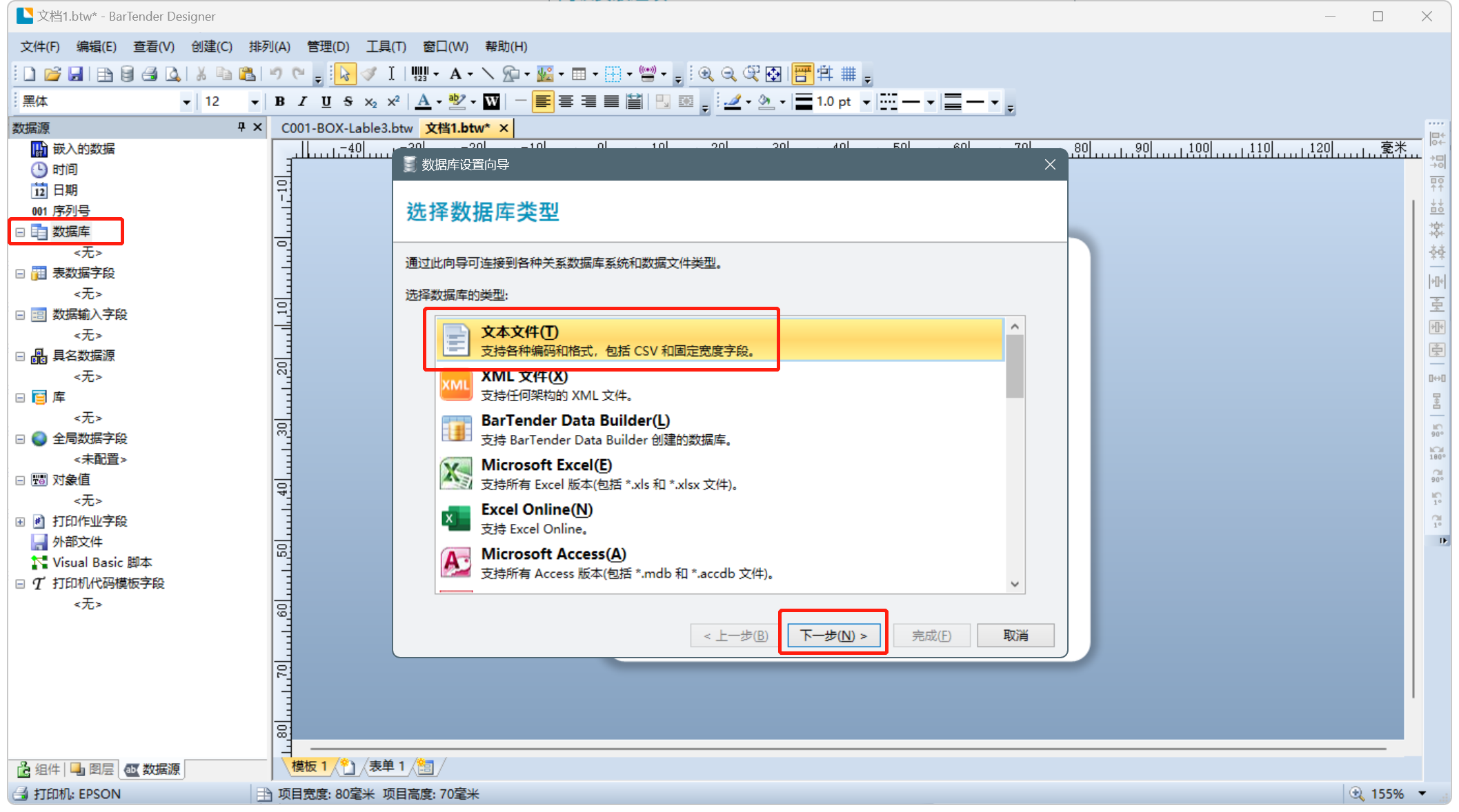 在 BarTender Designer 中创建标签,使用“数据库”来定义数据源,数据库类型选择“文本文件”。