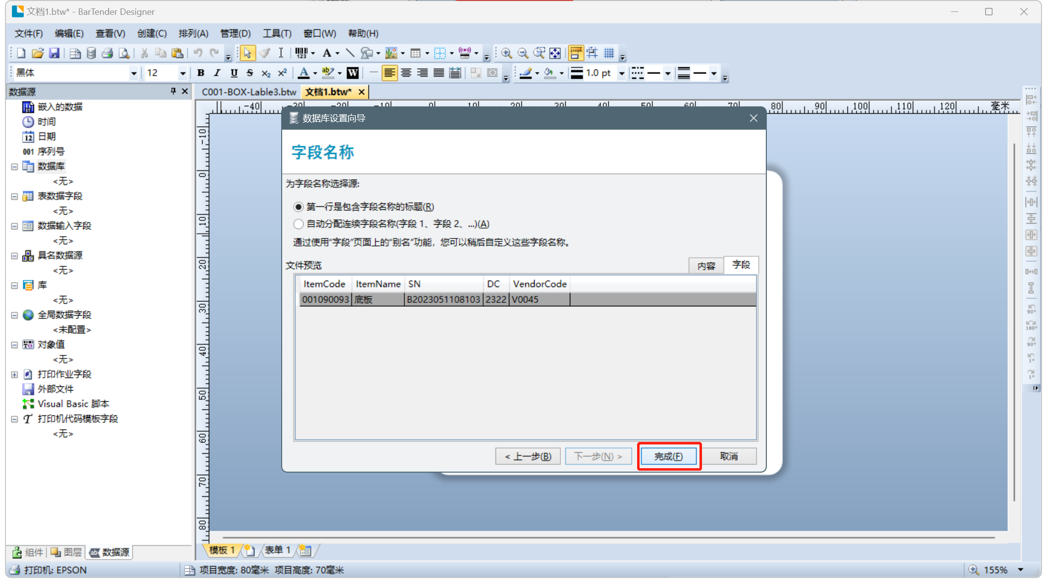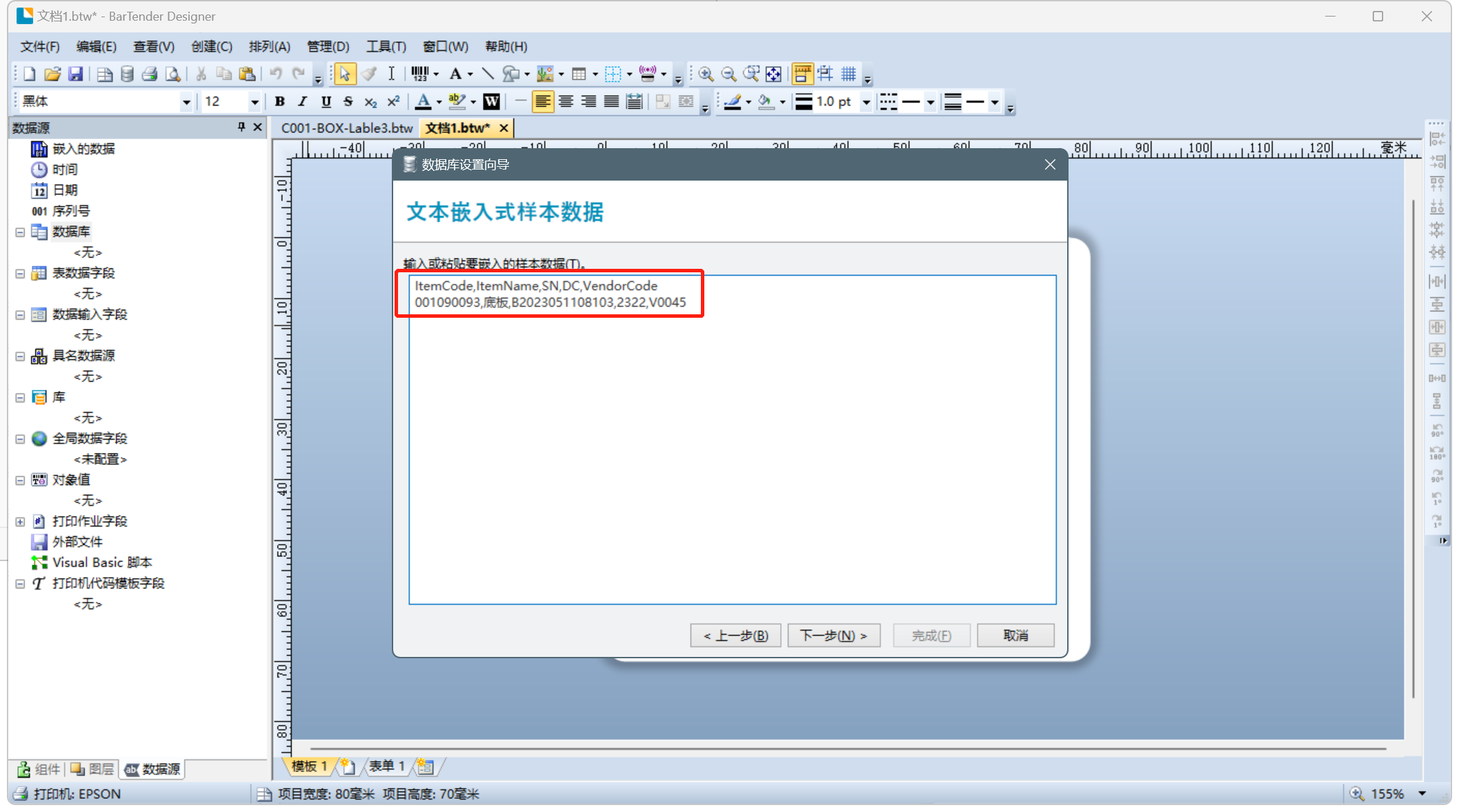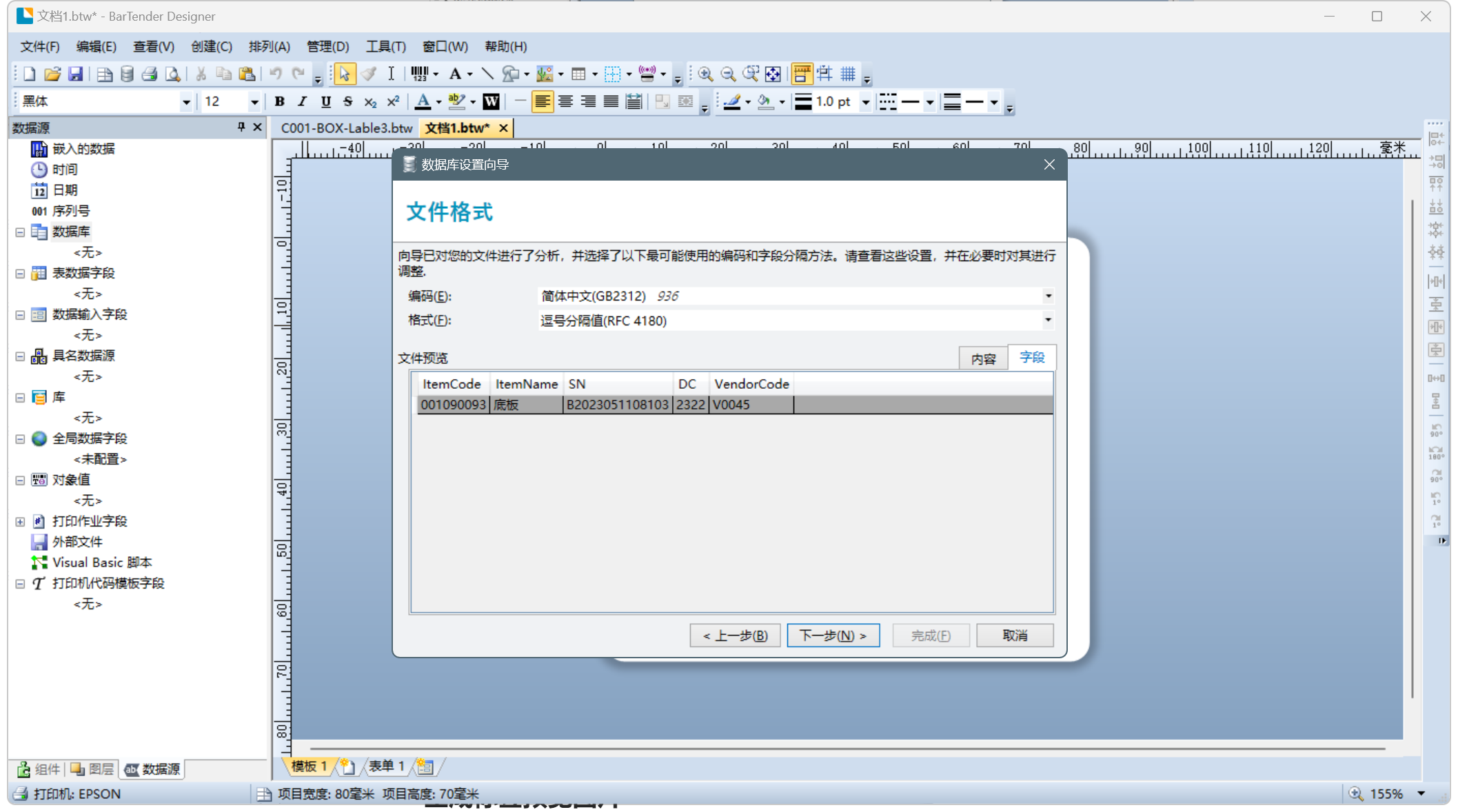在 BarTender Designer 中创建标签,使用“数据库”来定义数据源,数据库类型选择“文本文件”。