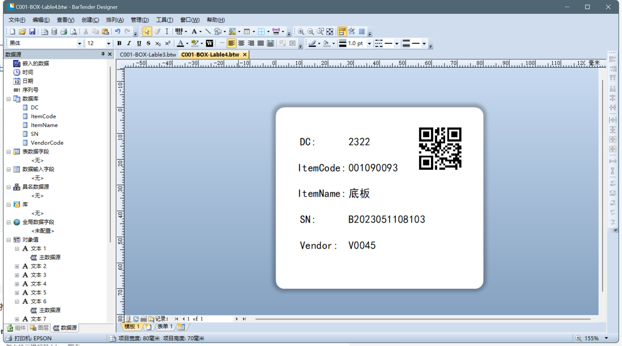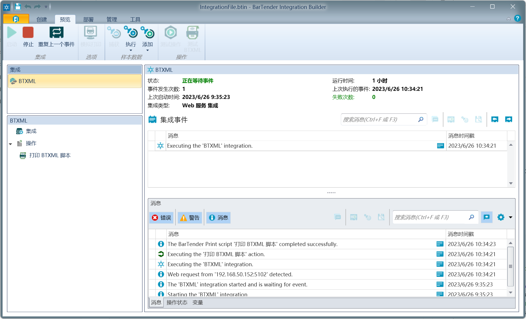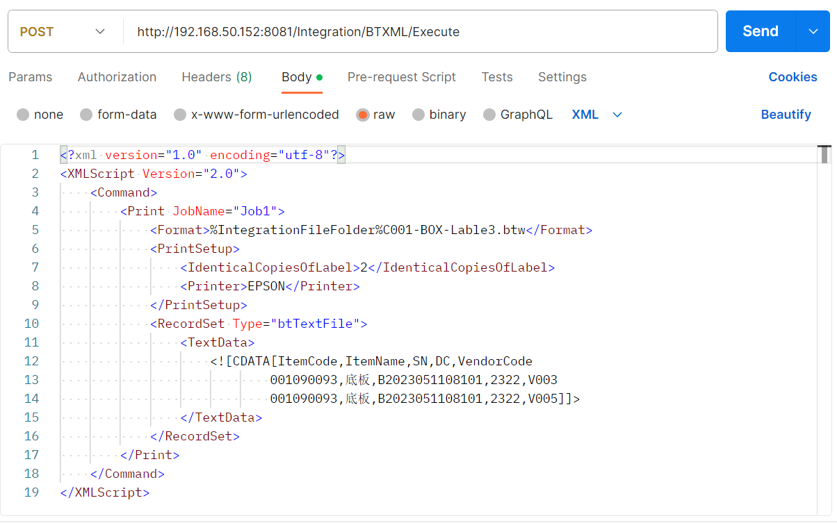 除了本例介绍的 BTXML 数据格式,还支持 JSON 数据格式的 Web 服务请求,但貌似每个请求仅支持打印一个标签(如一个包装标签、一个序列号),实际生产环境中更多的是需要多个标签批量的连续打印。建议先了解下 BarTender 中 BTXML、变量等基本概念,进而灵活运用集成工具,实现更复杂的标签打印功能。