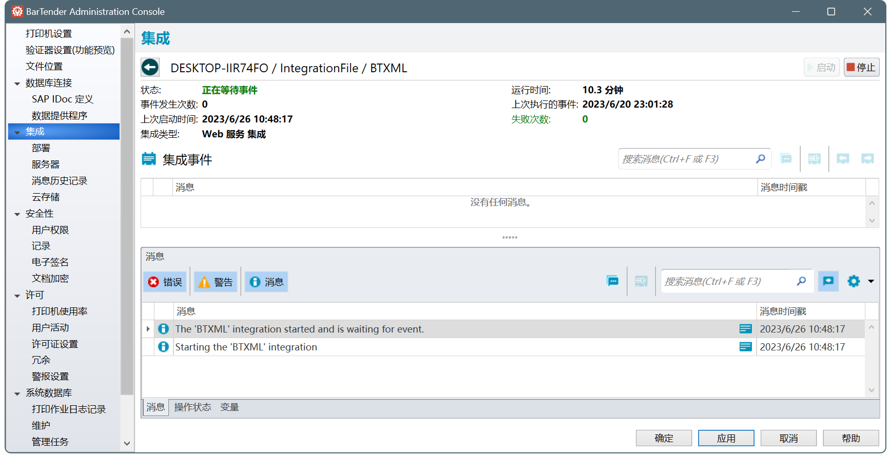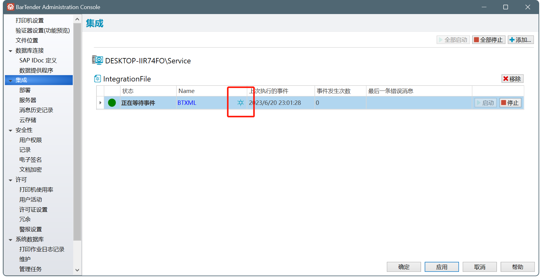 启动 Administration Console 工具,在集成页面可以进行启动或停止集成服务的操作,