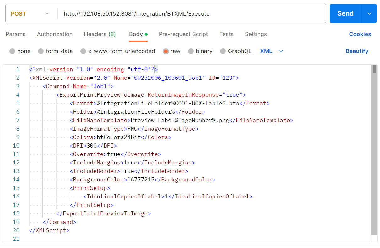 通过 Postman 工具发送标签预览请求,BarTender 服务将生成预览图片并返回预览图片的二进制数据。