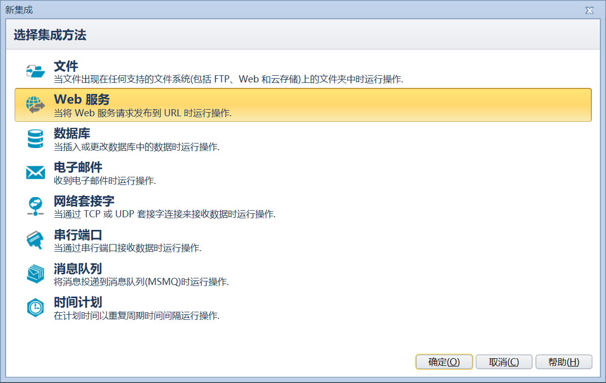 启动 Integration Builder 工具,创建集成服务,集成方式选择“Web 服务”。