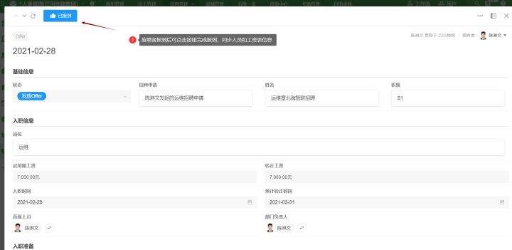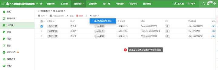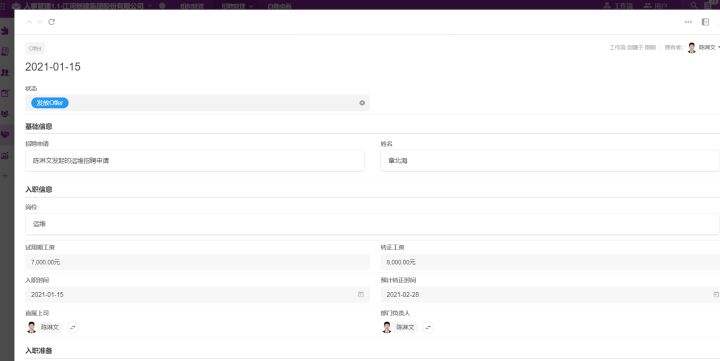 - **对于人才招聘:**从人才需求申请、审批,到招聘需求的发布;从人才简历的筛选入库、目标候选人的面试追踪和反馈,到准员工的入职办理,均形成一体联动可追溯的业务闭环。