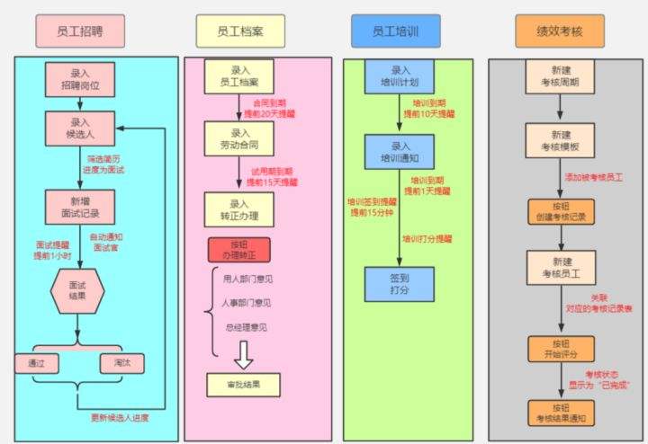在与江河集团对接初期,明道云实施顾问根据人事部要求,梳理出清晰的系统流程。依据该流程,实施顾问构建出一套综合解决方案。以下将介绍部分核心、特色的功能模块: