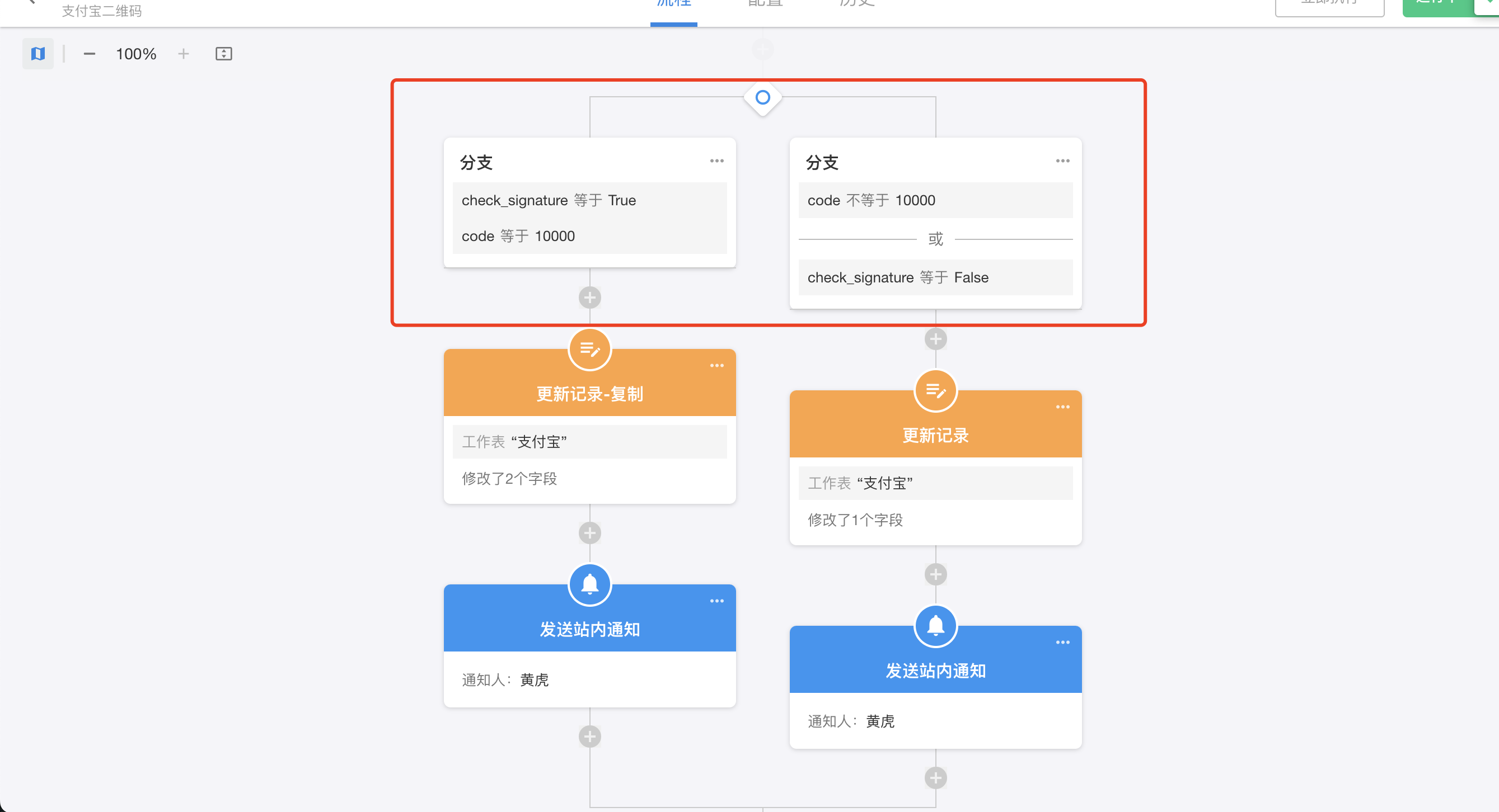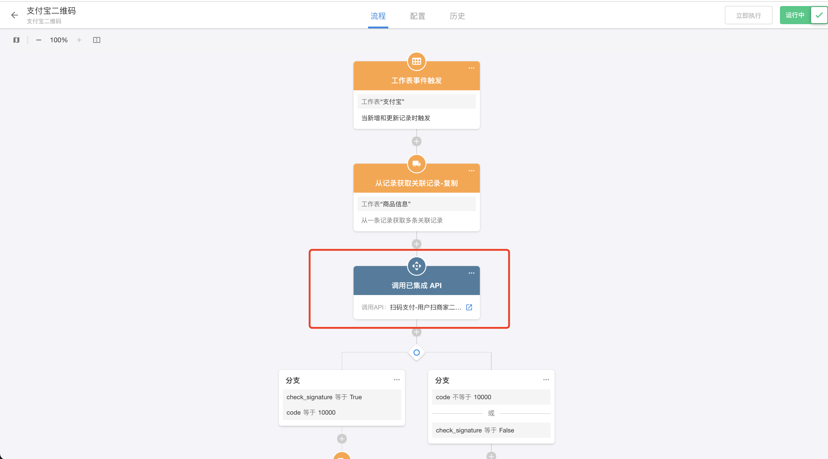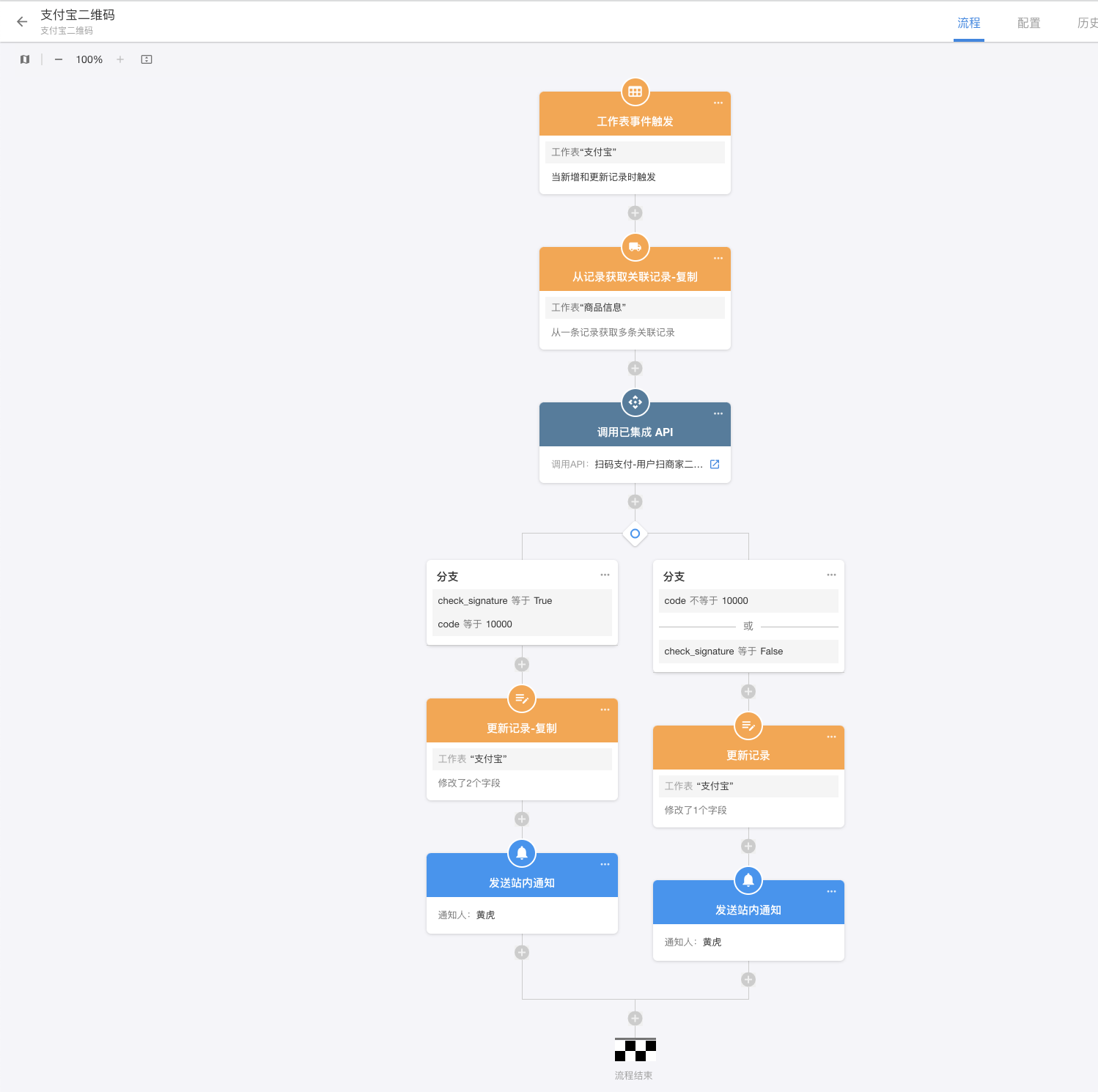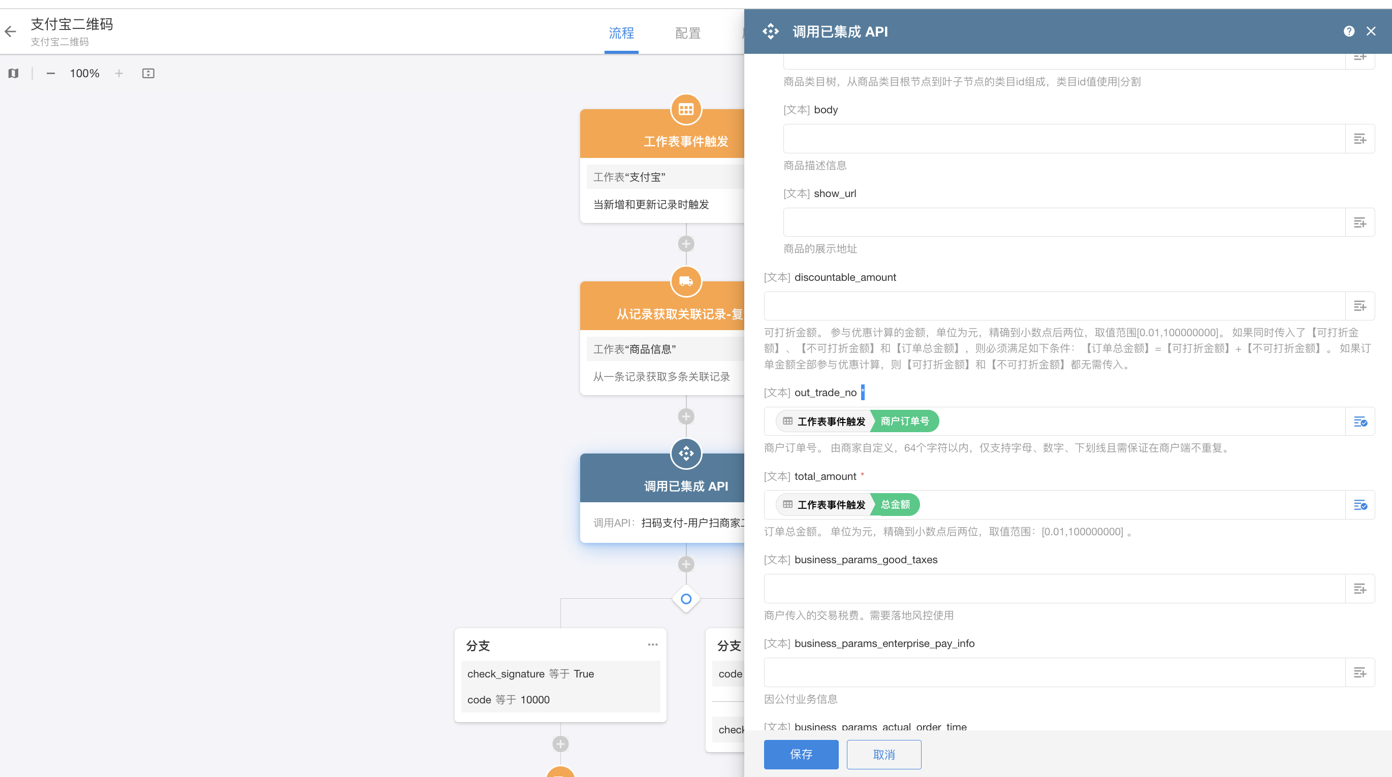 左边分支:若返回成功且验证签名为 True,更新写入订单状态(枚举值:未创建、创建成功),更新写入二维码链接(因前面配置过