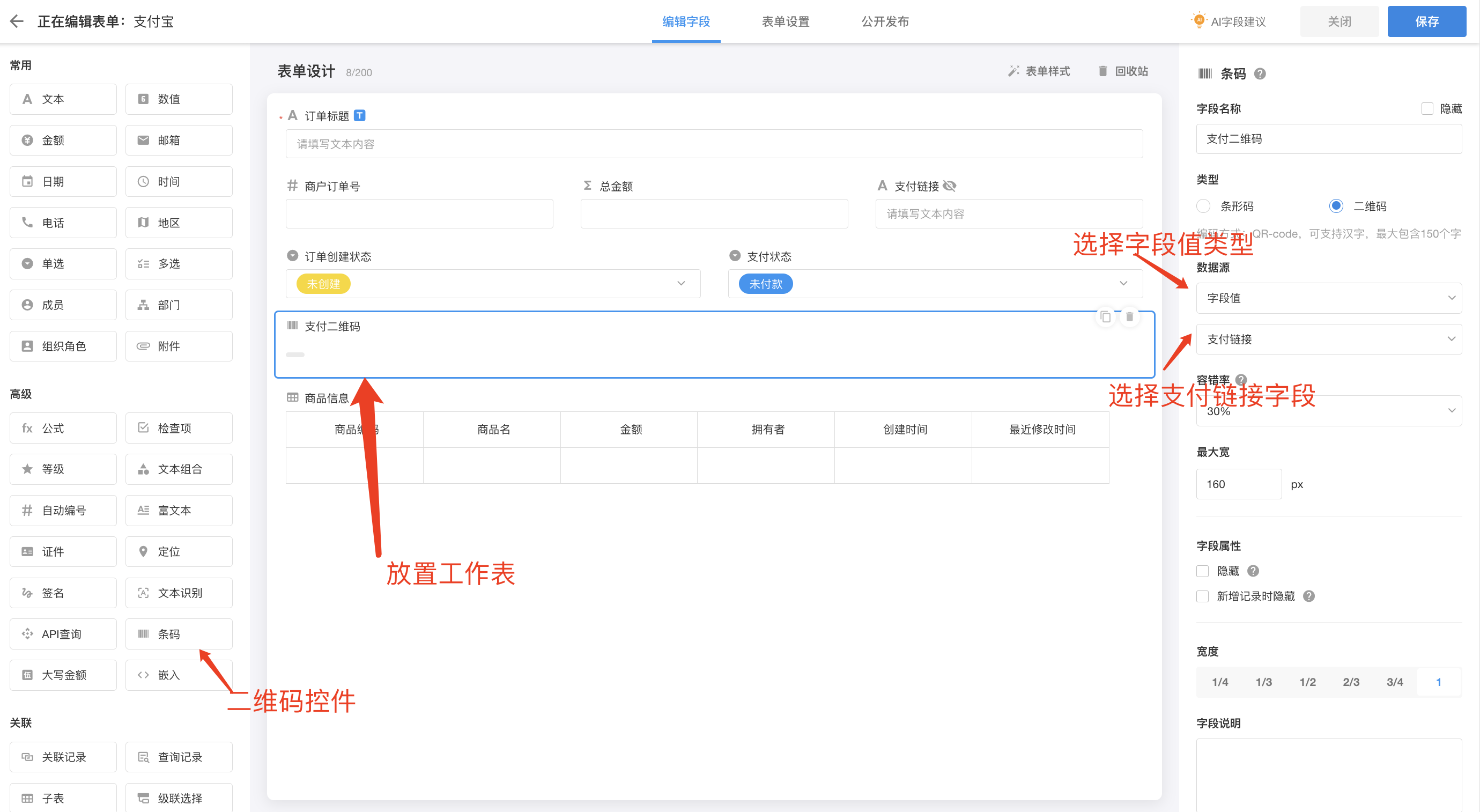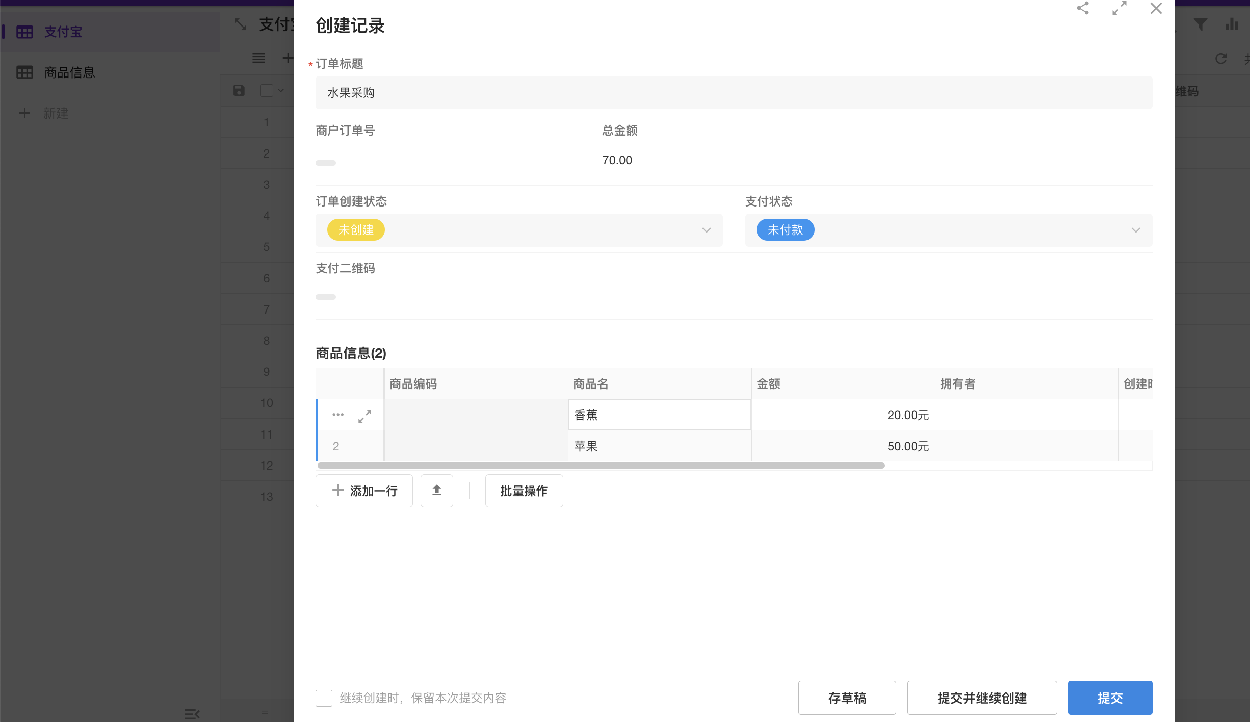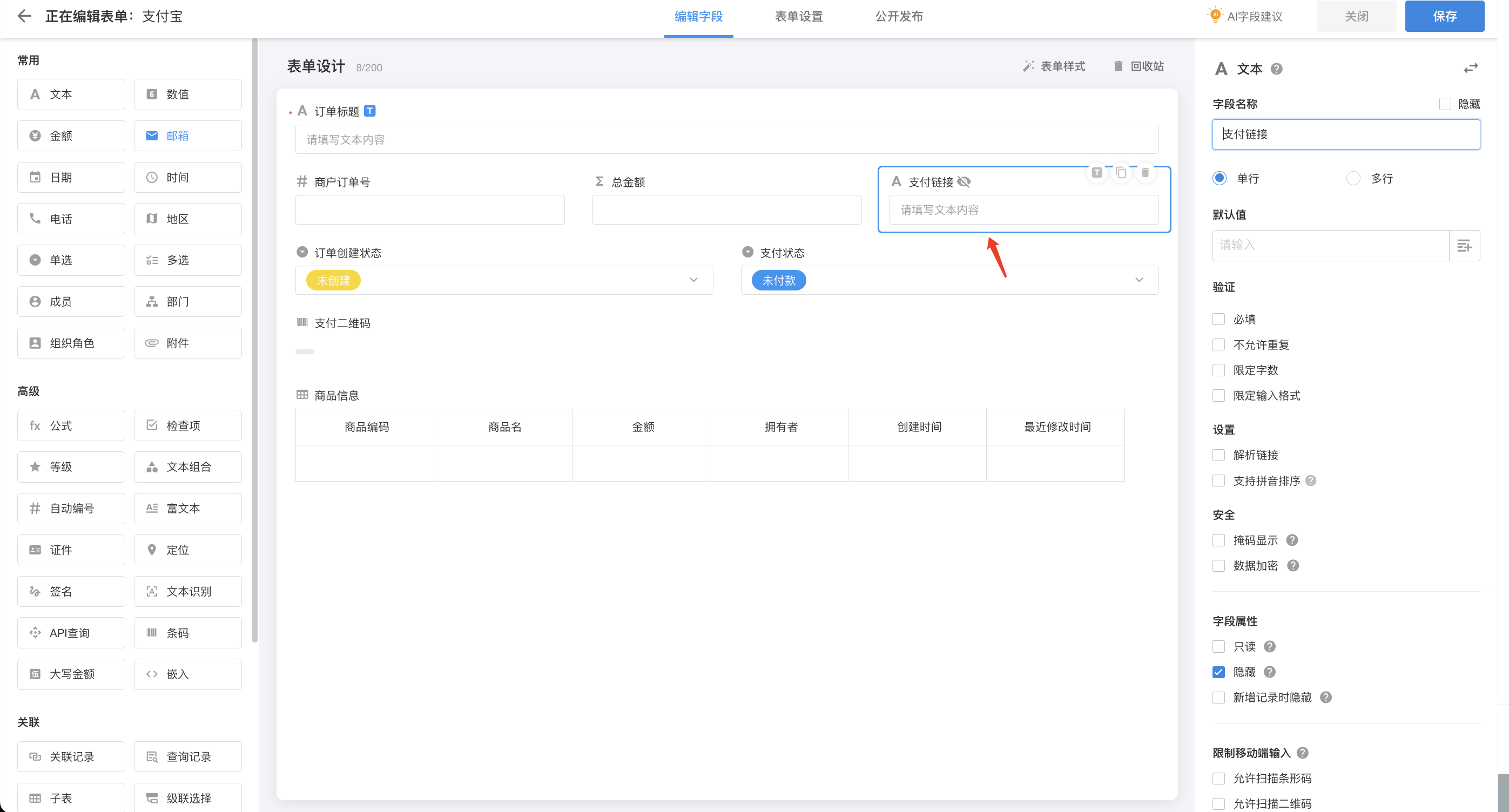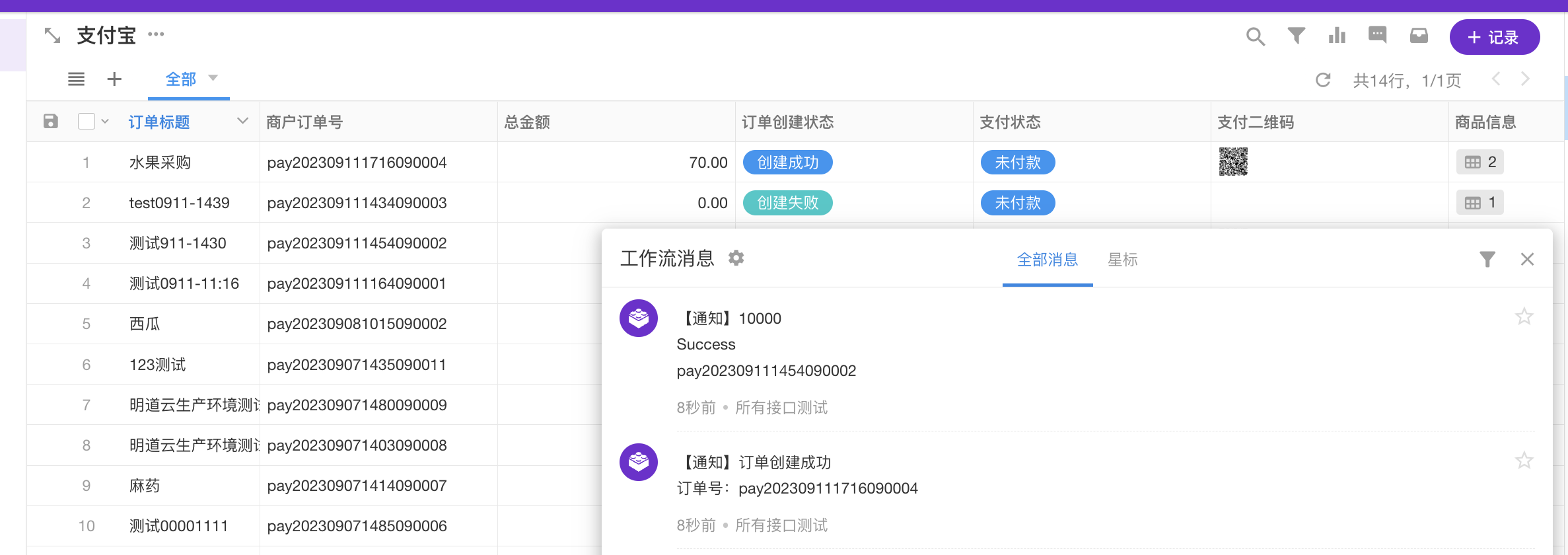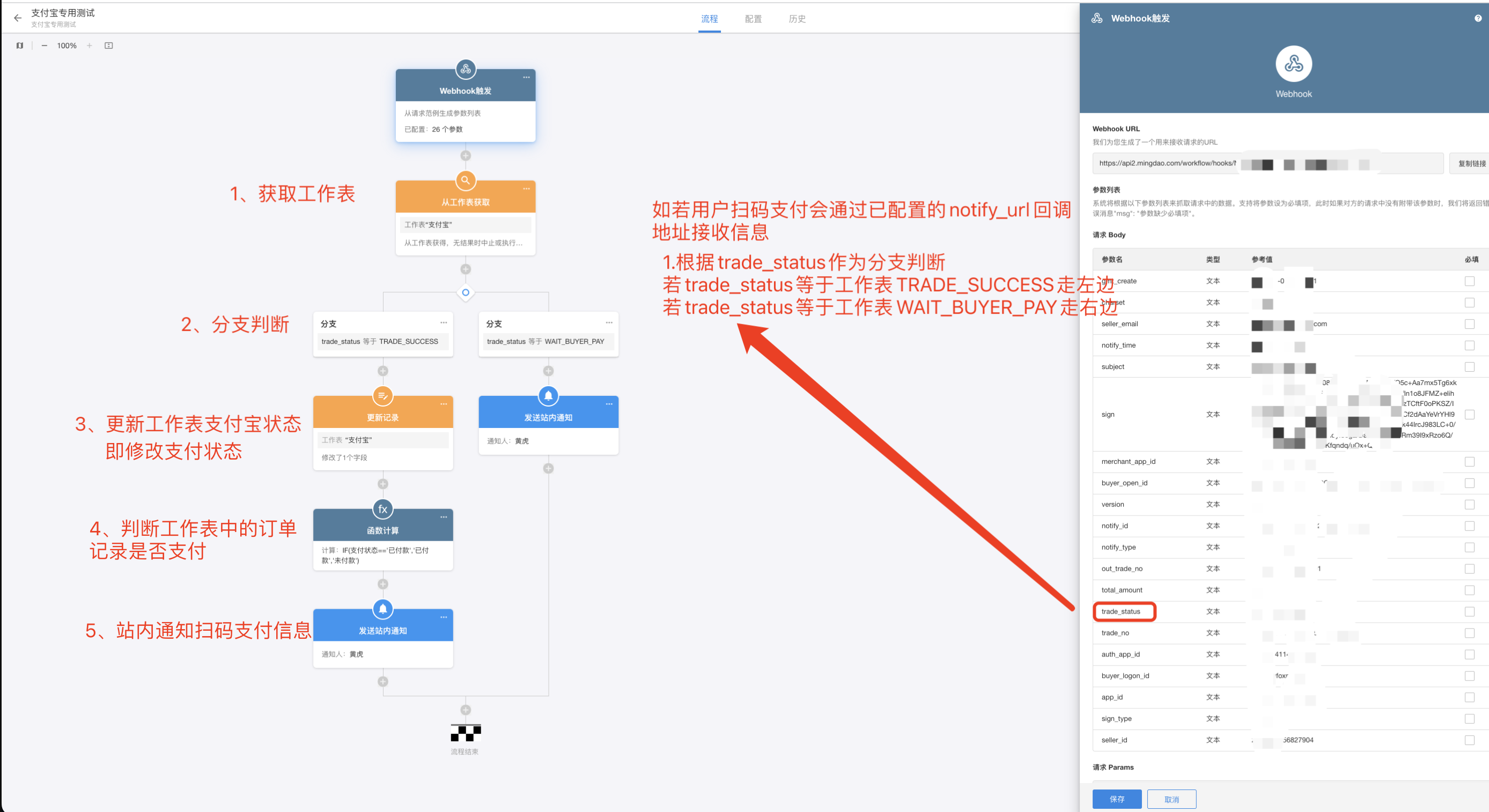 左边分支:若返回成功且验证签名为 True,更新写入订单状态(枚举值:未创建、创建成功),更新写入二维码链接(因前面配置过