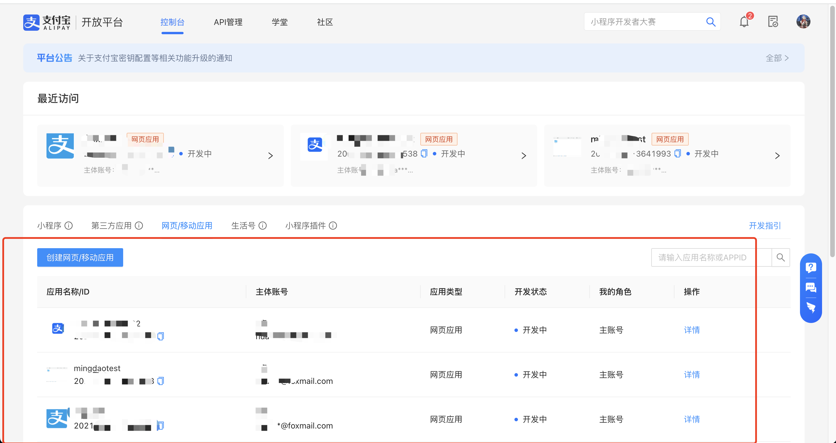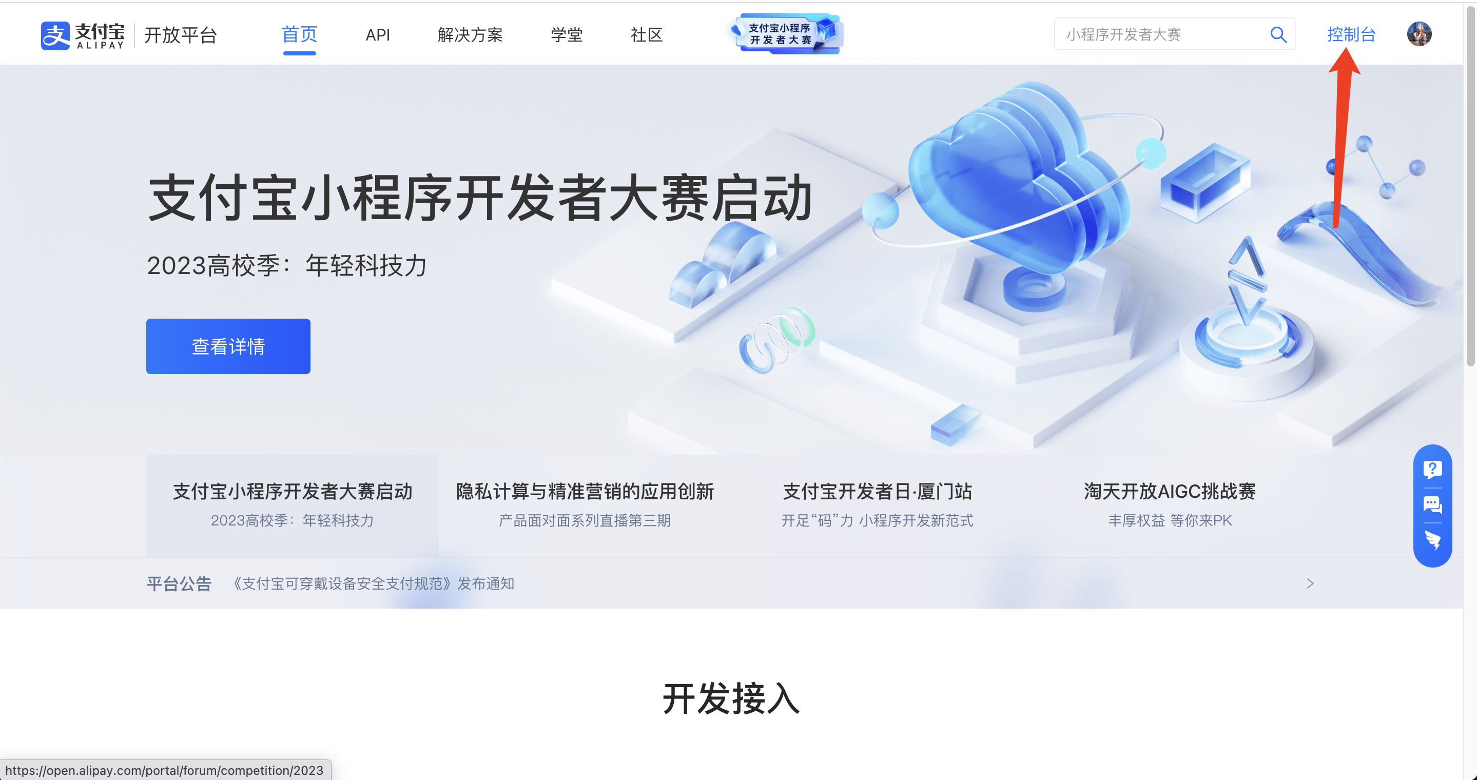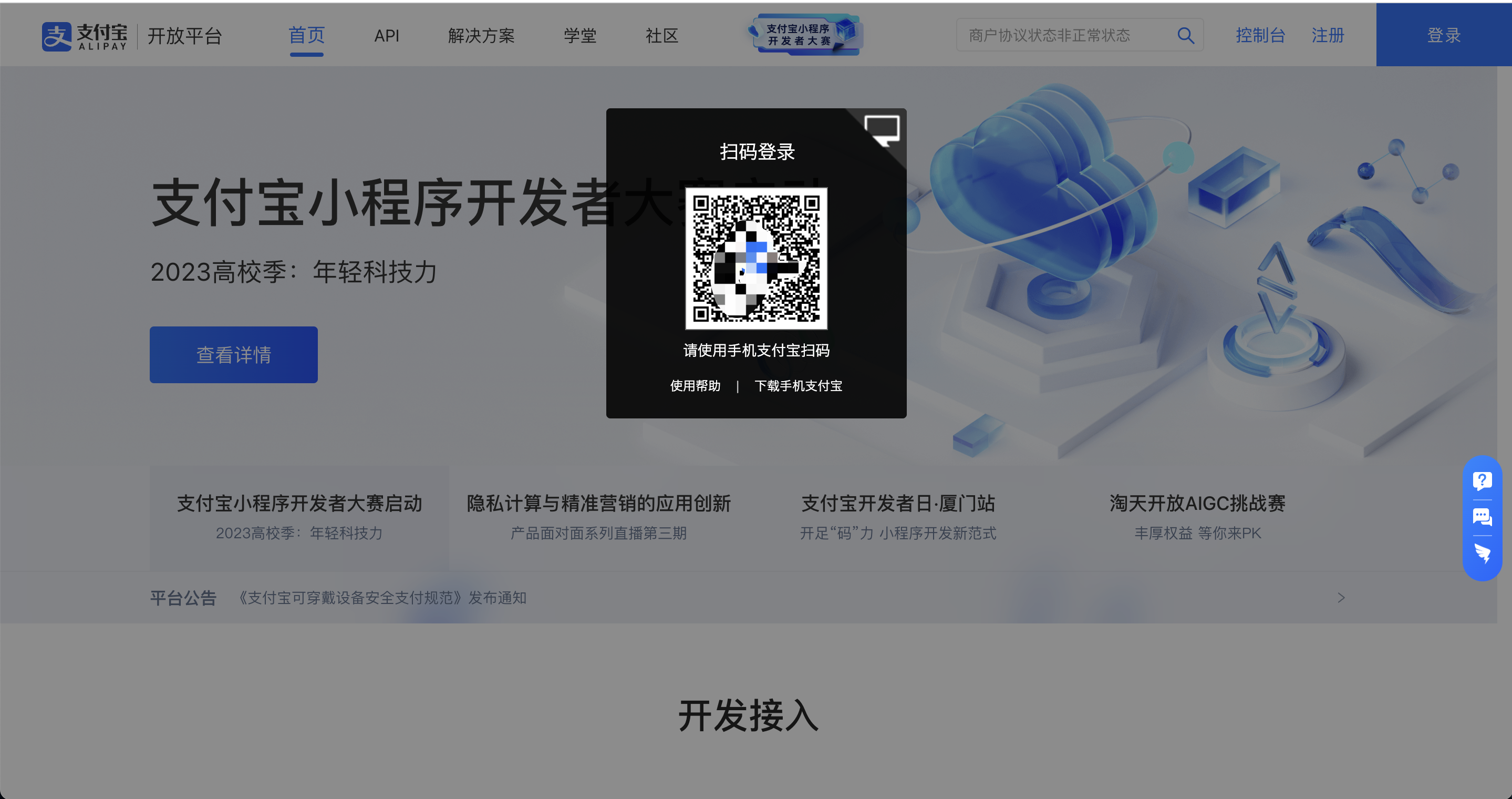 - 访问支付宝开放平台:https://open.alipay.com 网页后扫码登陆。