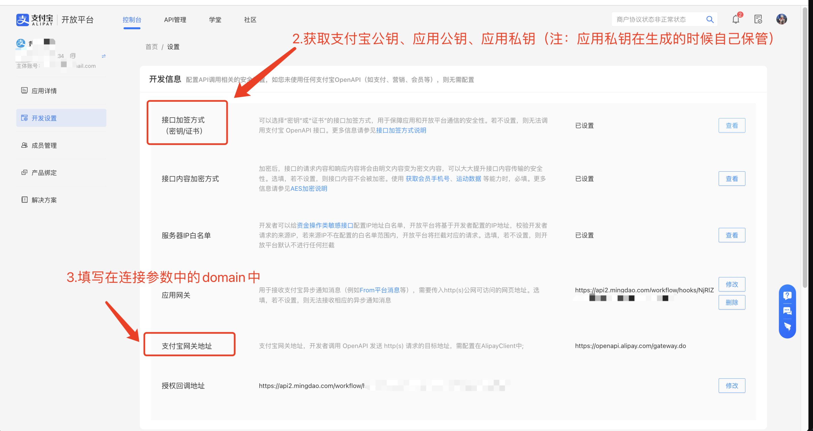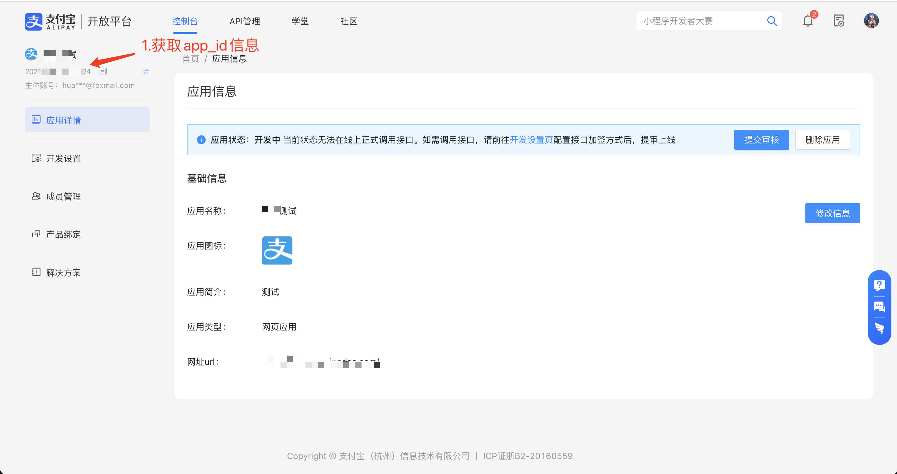 - 选择应用进入查看应用详情。请将 app_id、应用私钥、应用公钥、支付宝公钥、支付宝网关地址填入连接参数中。连接参数中的 notify_url 是用作支付回调使用,可选,如需用户付款后需要通知请加上 webhook 的配置。