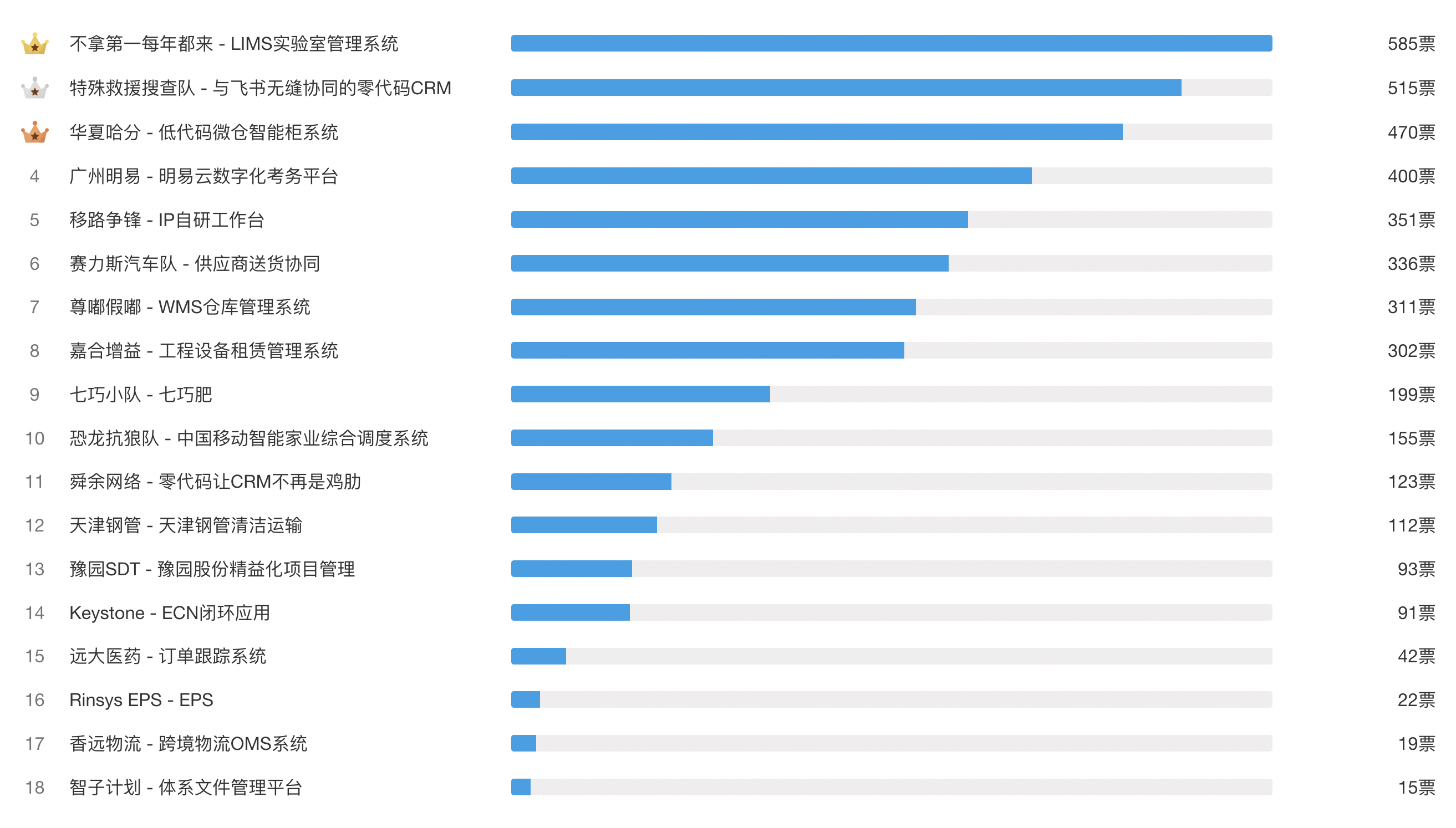 感谢每一位为本次活动投票的网友,您们的参与使得这次活动更加完美。同时,我们也要向所有参赛队伍表示深深的感谢,是你们的努力和创意,展现了“超越代码开发”的无限可能。根据投票规则,我们为前 10 名队伍分别加 1 到 10 分,最终结果如下: