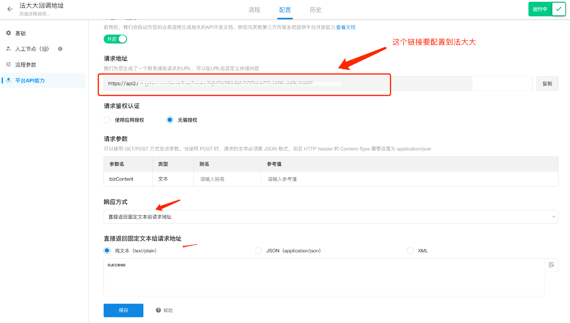 说明:使用了明道云的封装业务流程来接收回调信息,需要在法大大配置回调链接信息