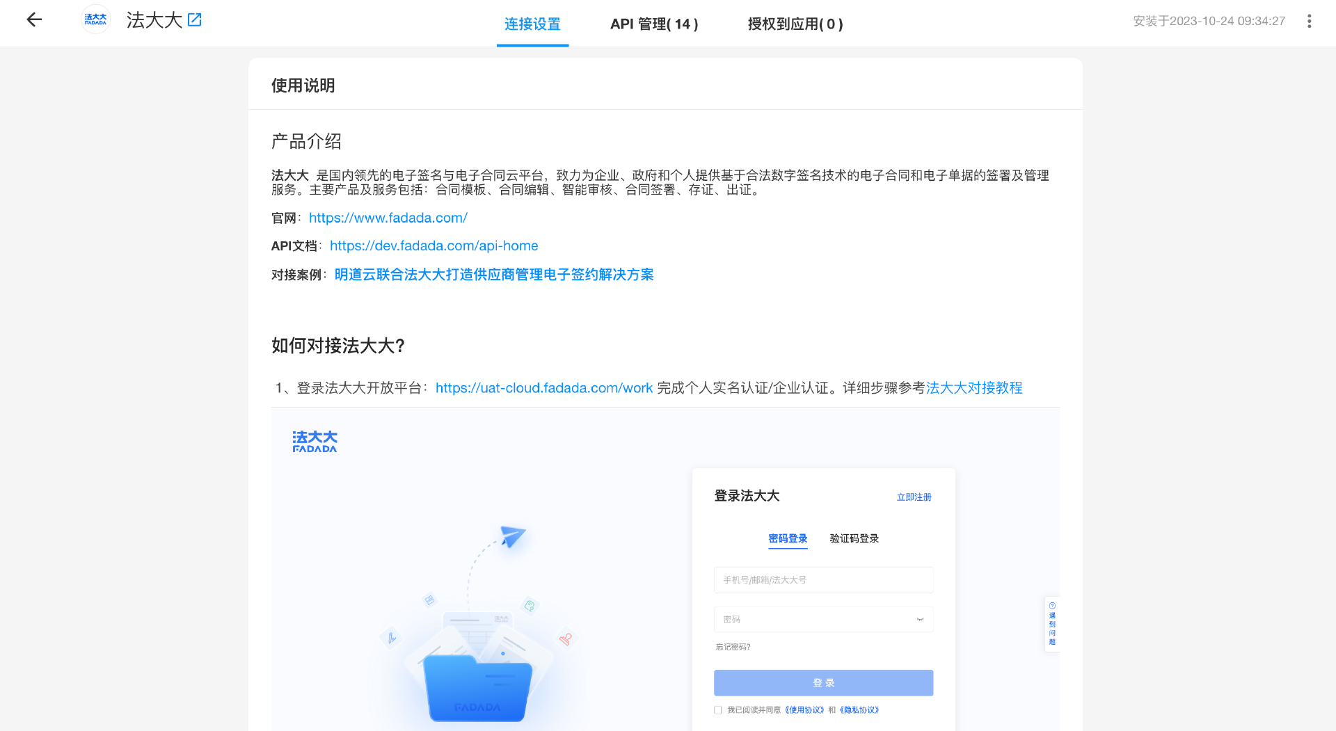 1.在 API 库中搜索“法大大”,并进行安装(路径:集成中心 ➡️API 库)