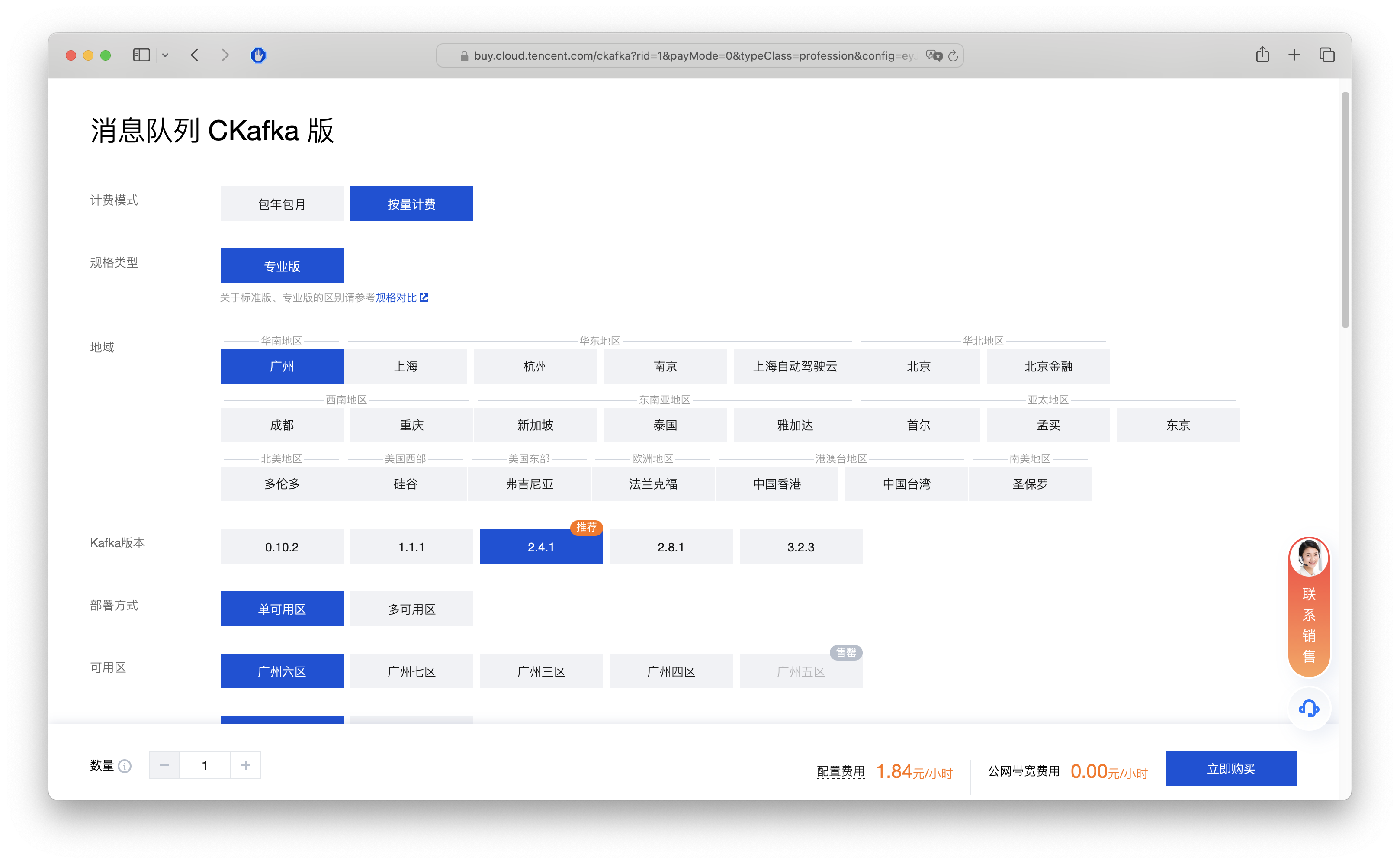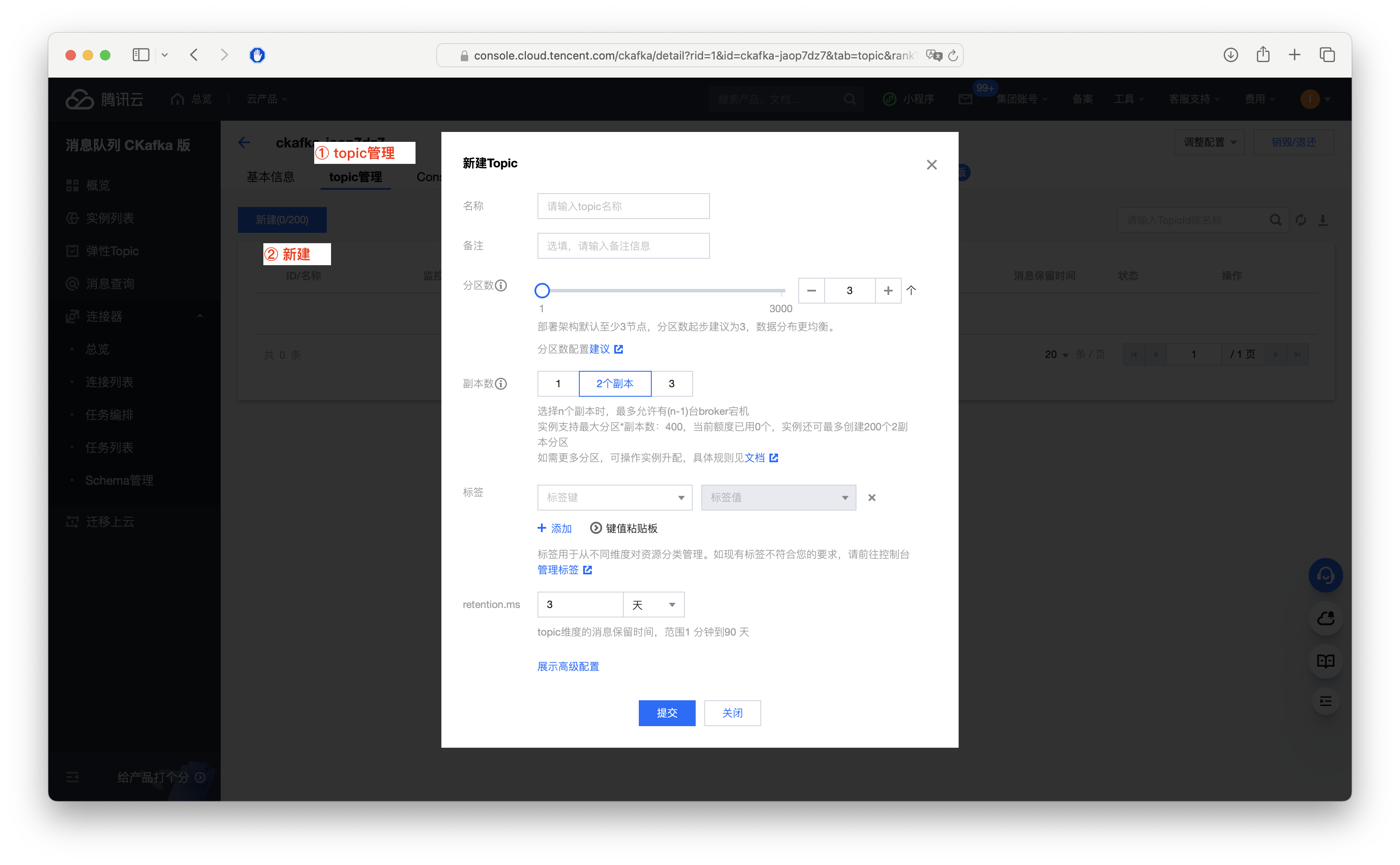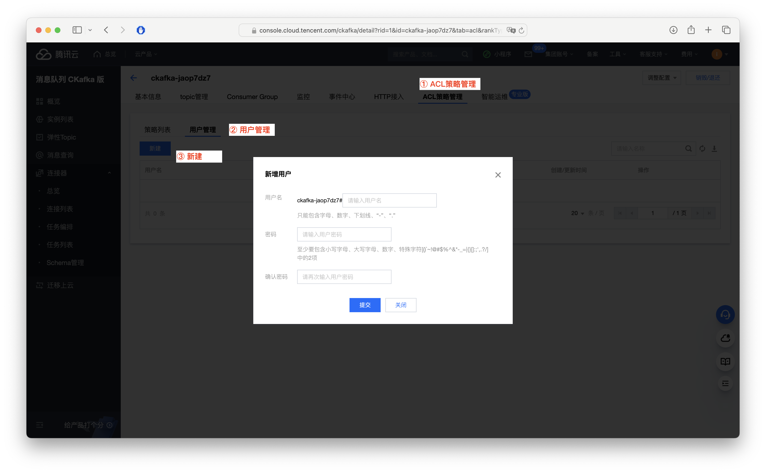 以腾讯云 Kfaka 举例子,购买地址:https://buy.cloud.tencent.com/ckafka ,当然如果有自己的 kafka 地址也可以用自己的来测试,但是注意将明道云的访问 IP(106.75.14.110, 123.59.59.220)加到白名单