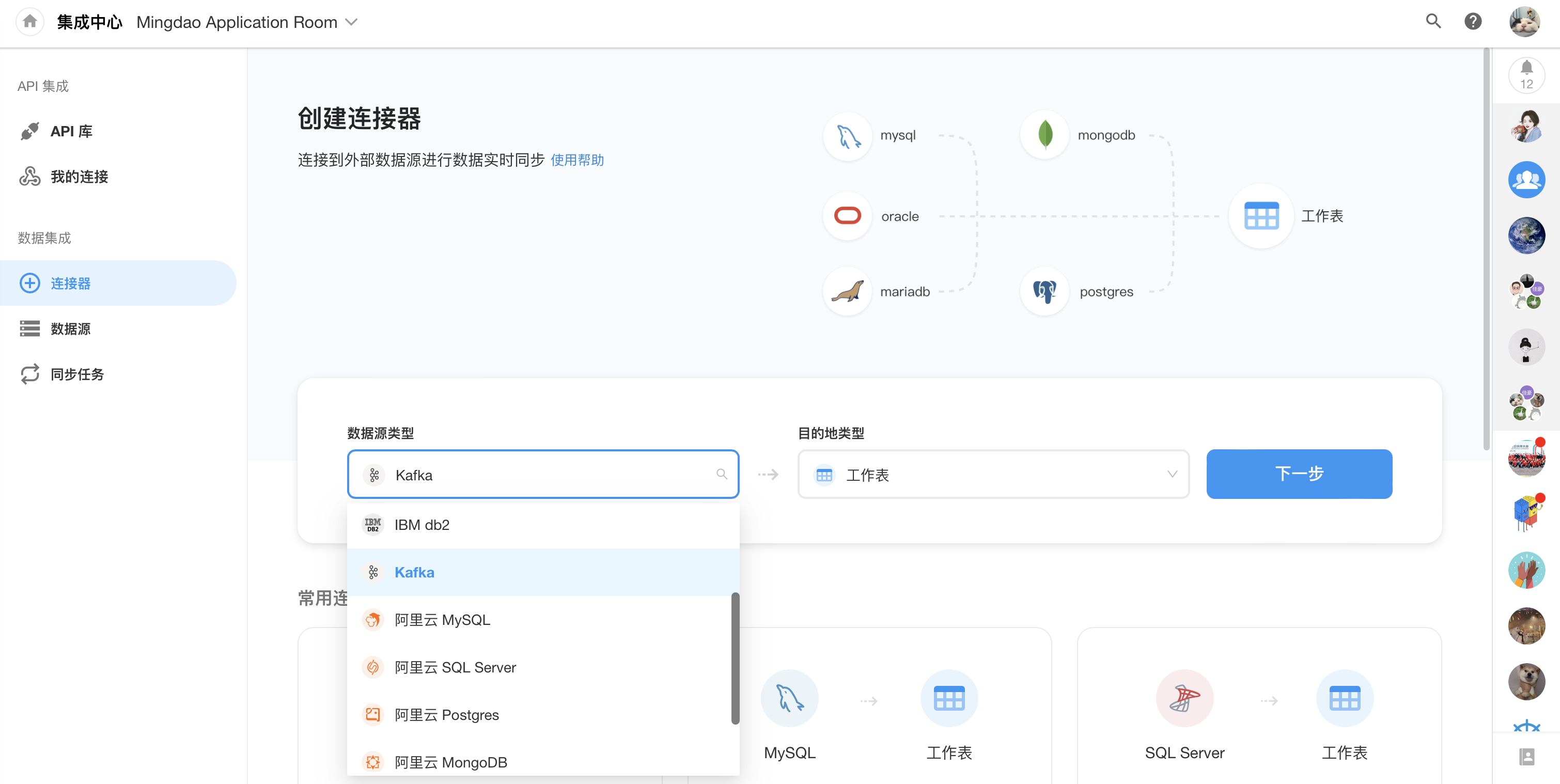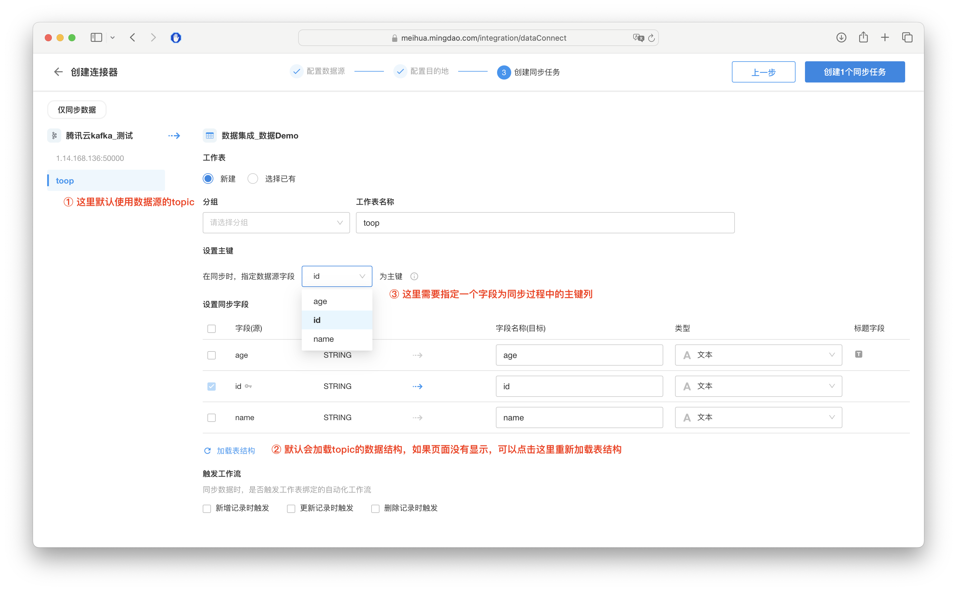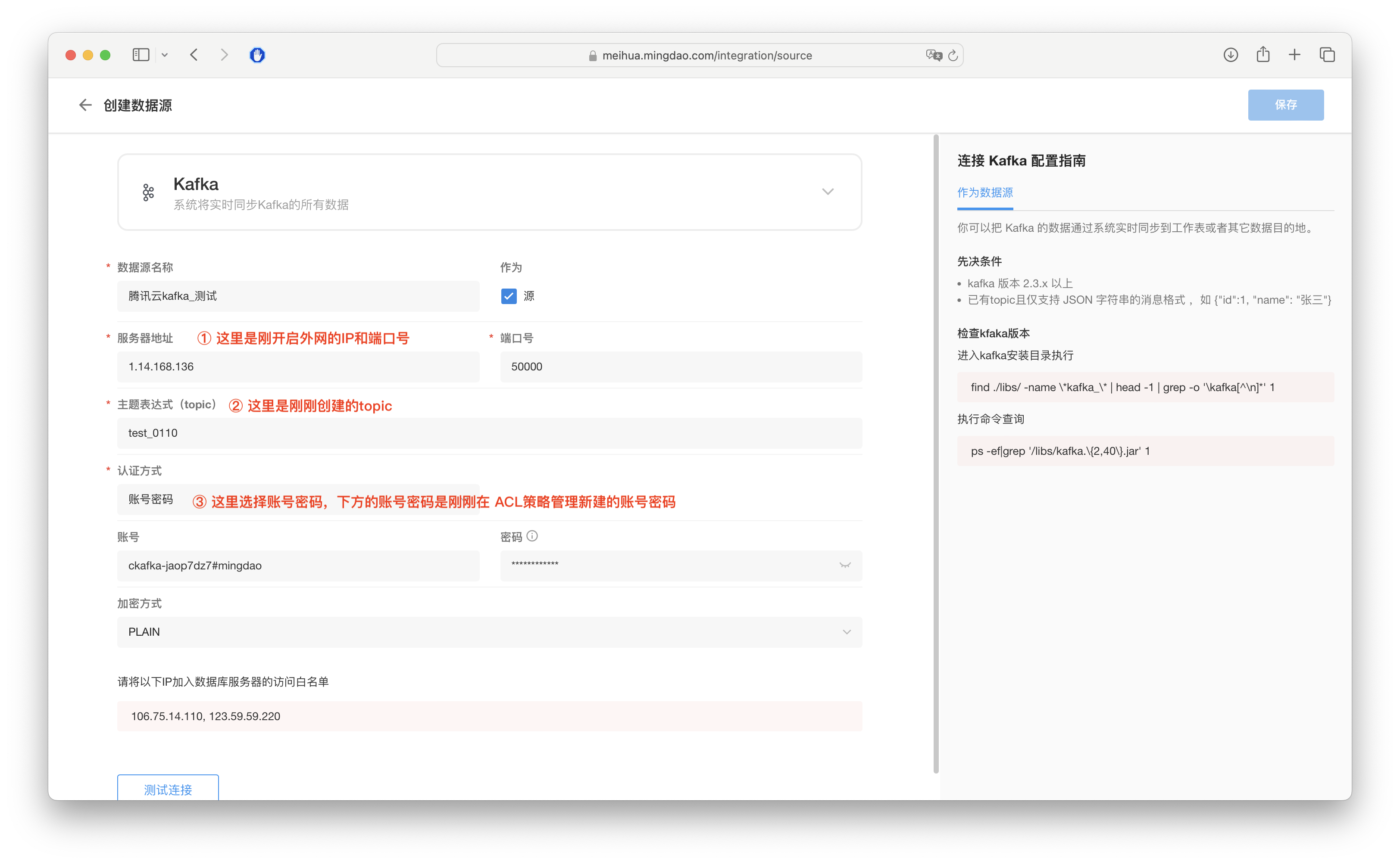 在集成中心创建同步任务的前提是要先有一个可以连通的数据源,这就是刚刚在 kafka 侧开启外网访问的用处。