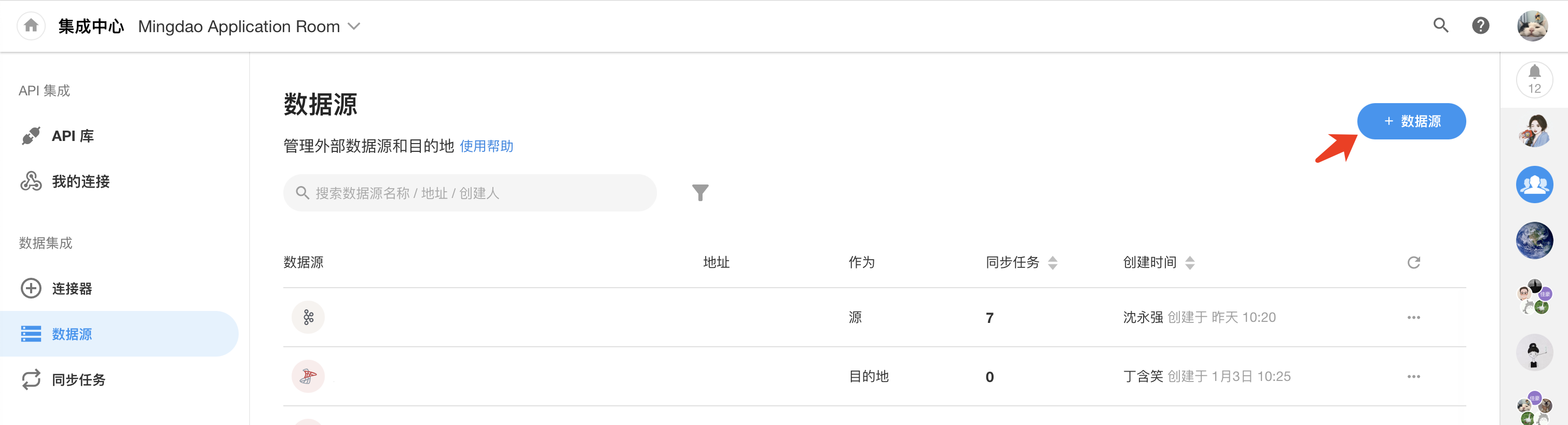 - 进入 明道云数据集成页面 https://mingdao.com/integration/source