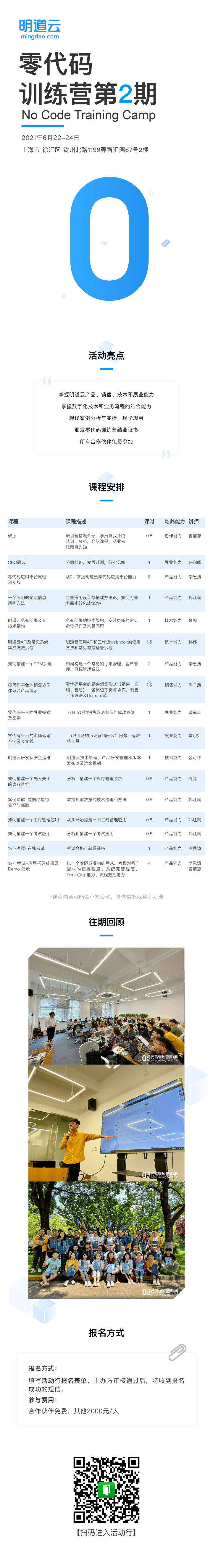 明道云零代码训练营,源于明道黄埔学院——明道内部员工的培训体系,从 2014 年至今已经开办了 87 期,总计培训了近五百位学员。
