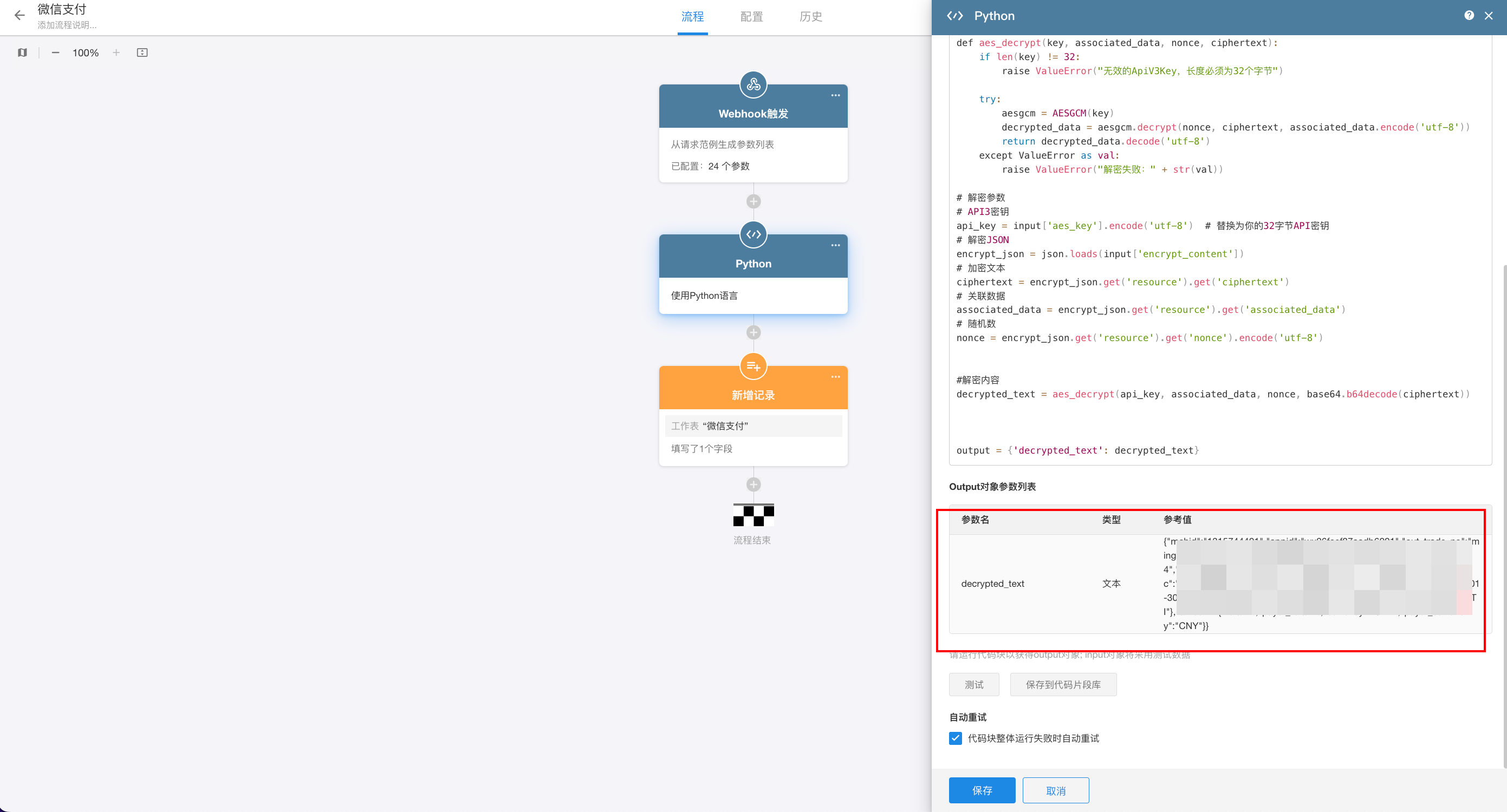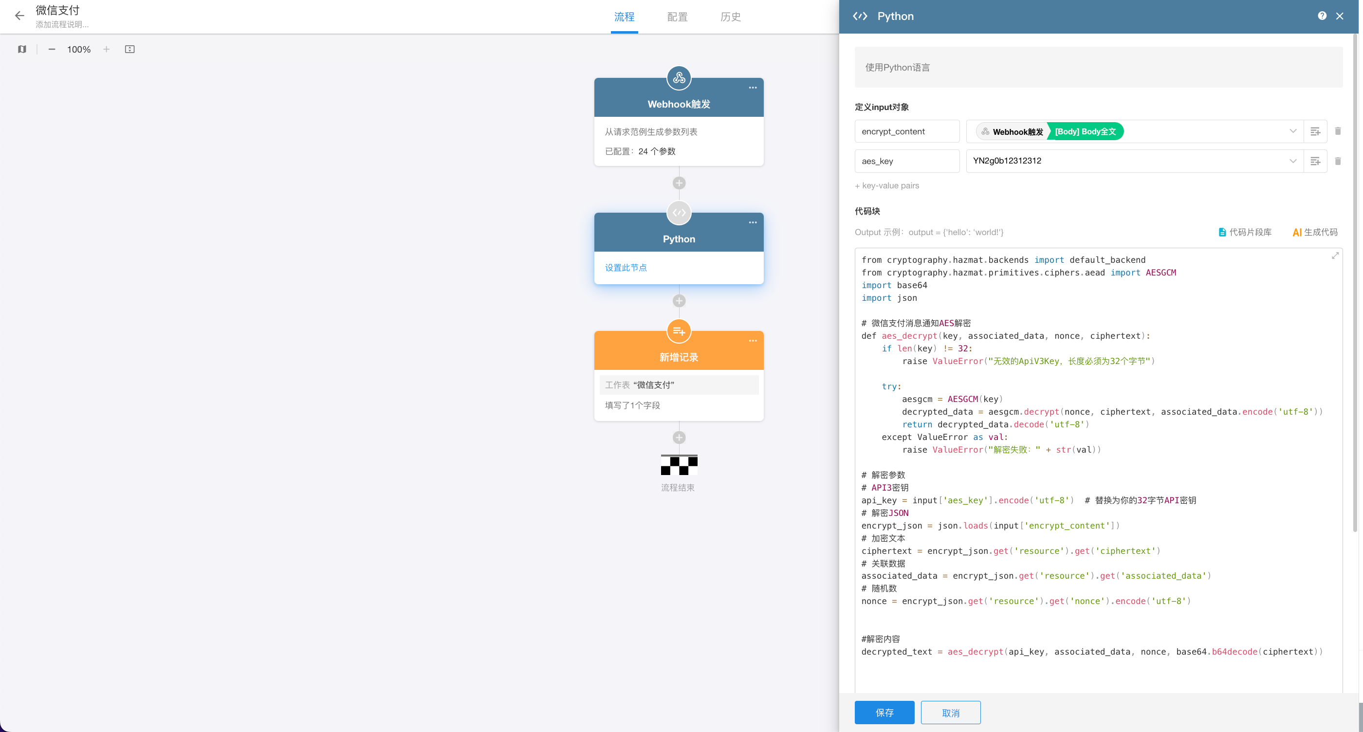 2.我们需要 webhook 工作流中添加一个代码块,并配置上我们在前面勾选上的“生成 body 全文参数”,并将 API v3 密钥填入到 aes_key 中。