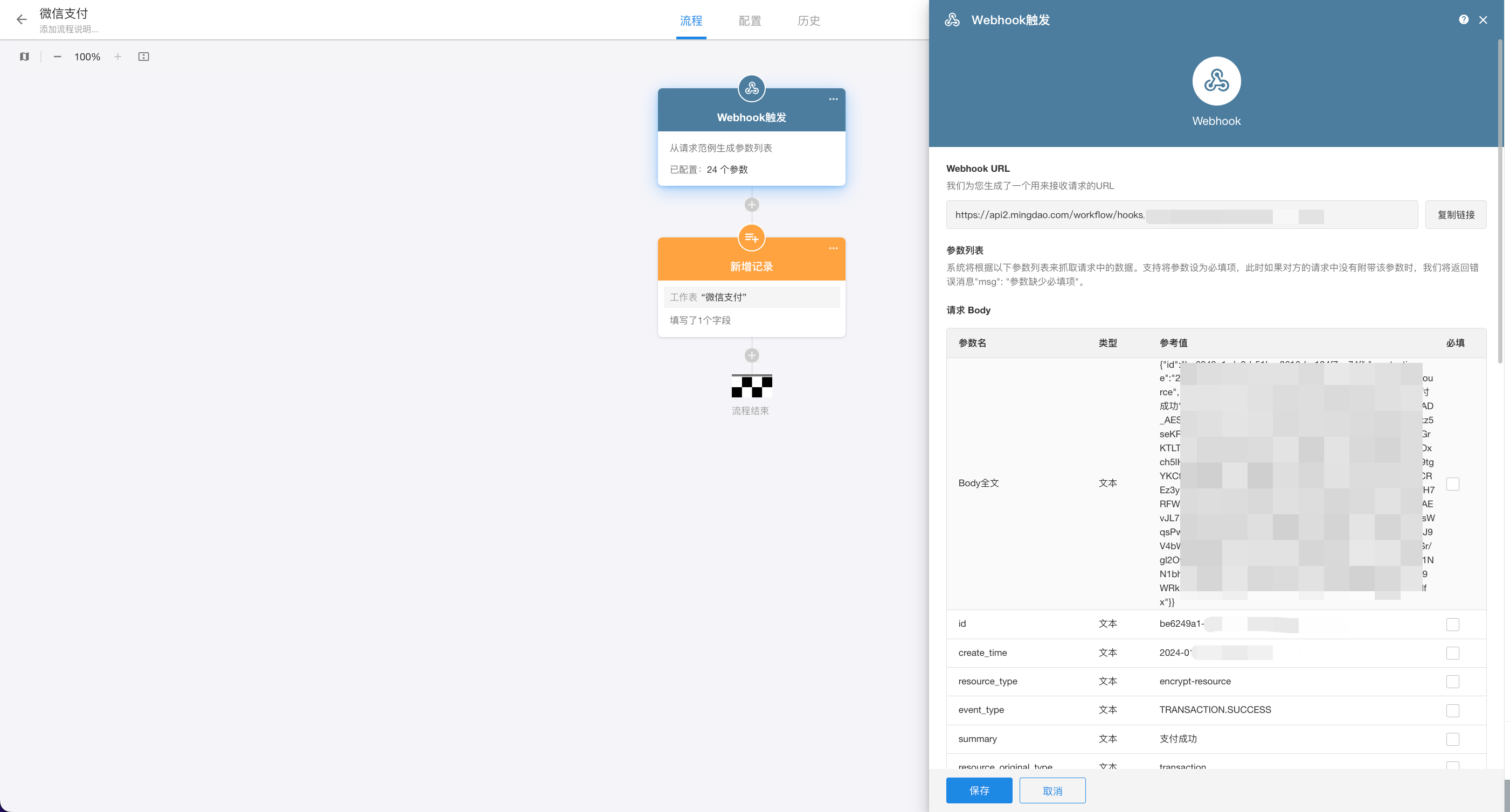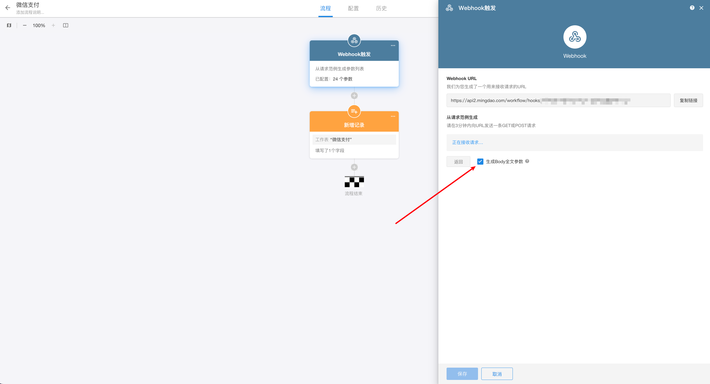 3.用户手机扫码后,在确认支付前需要到生成异步通知的工作流中,勾选上“生成 Body 全文参数”,随后立刻支付即可获取到异步通知消息。