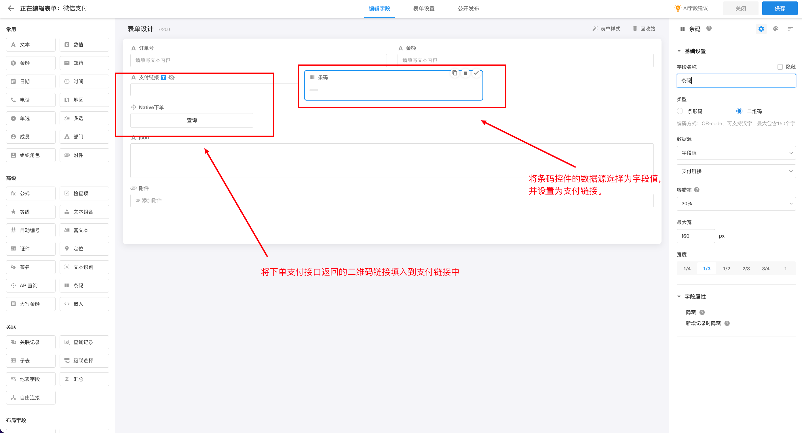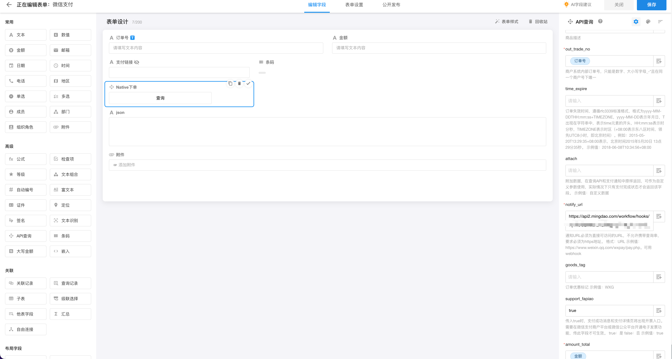 1.在工作表中按照图片的描述进行配置,且需要创建一个 webhook 工作流将地址填入接口参数中。注:微信支付的 Native 下单接口的支付金额单位是分。
