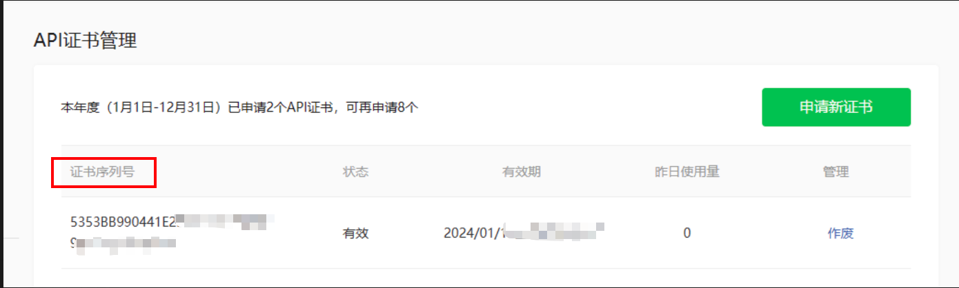 5.最后将 API 证书管理中的证书序列号的内容填入连接参数中。