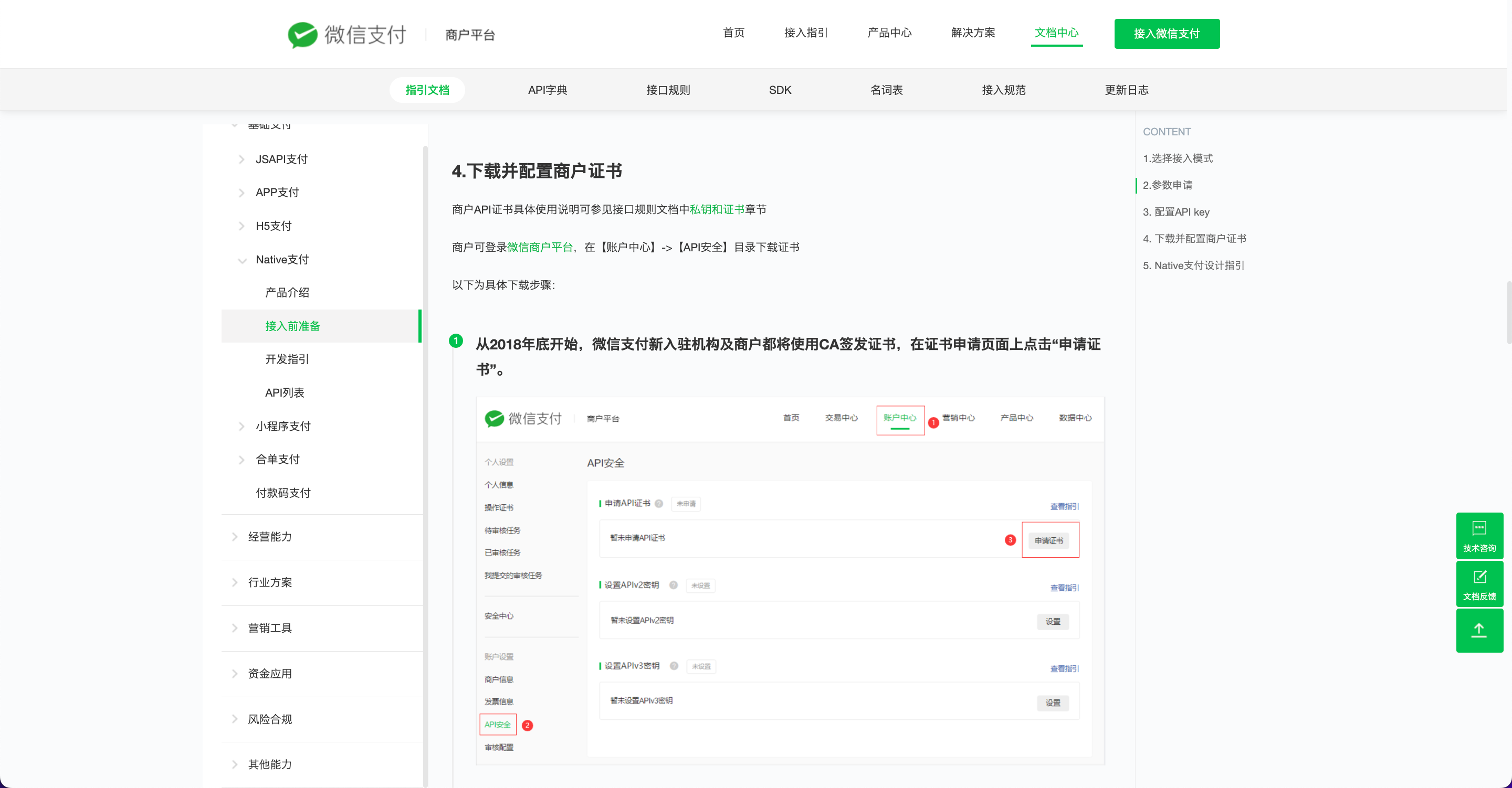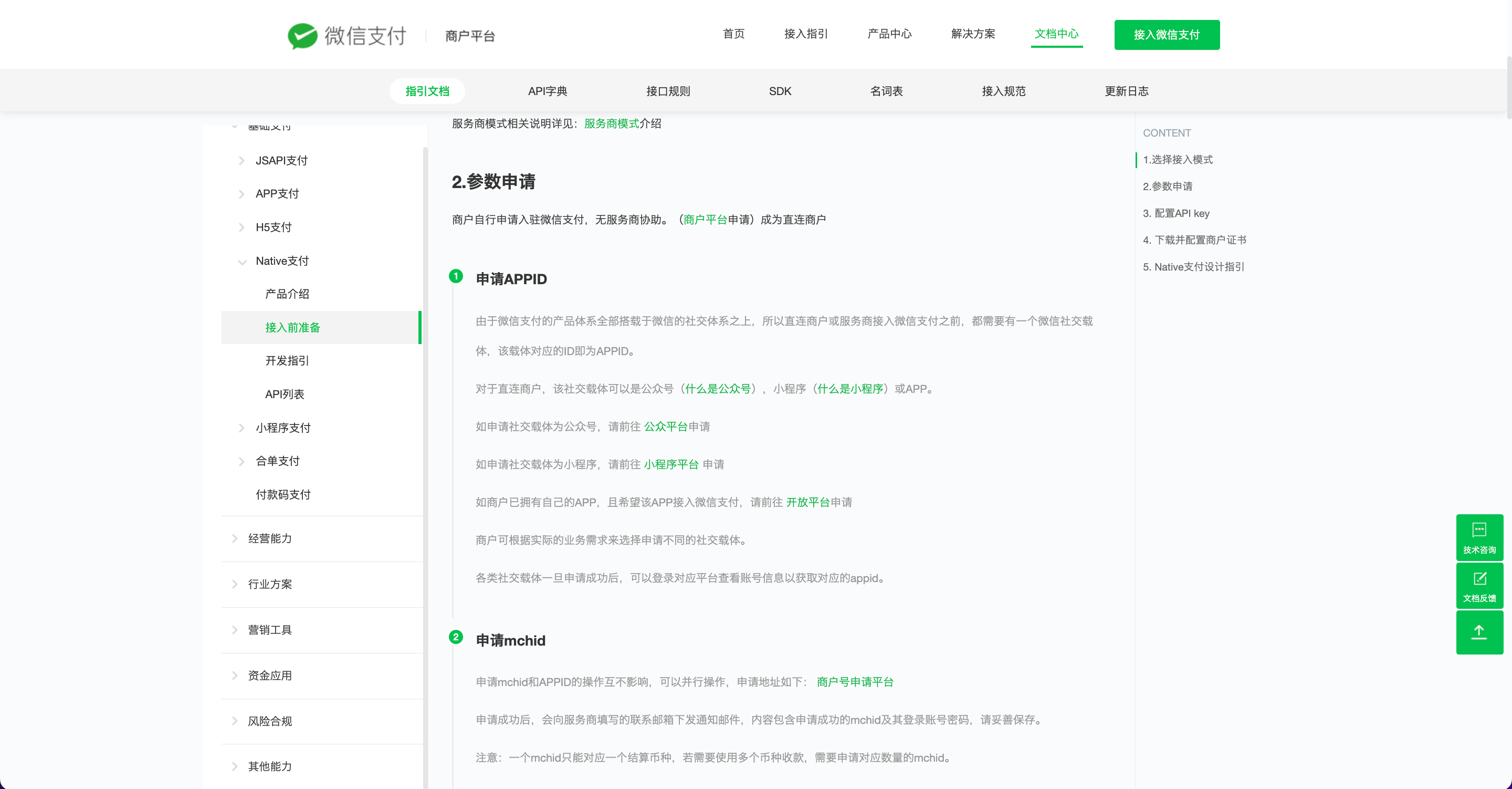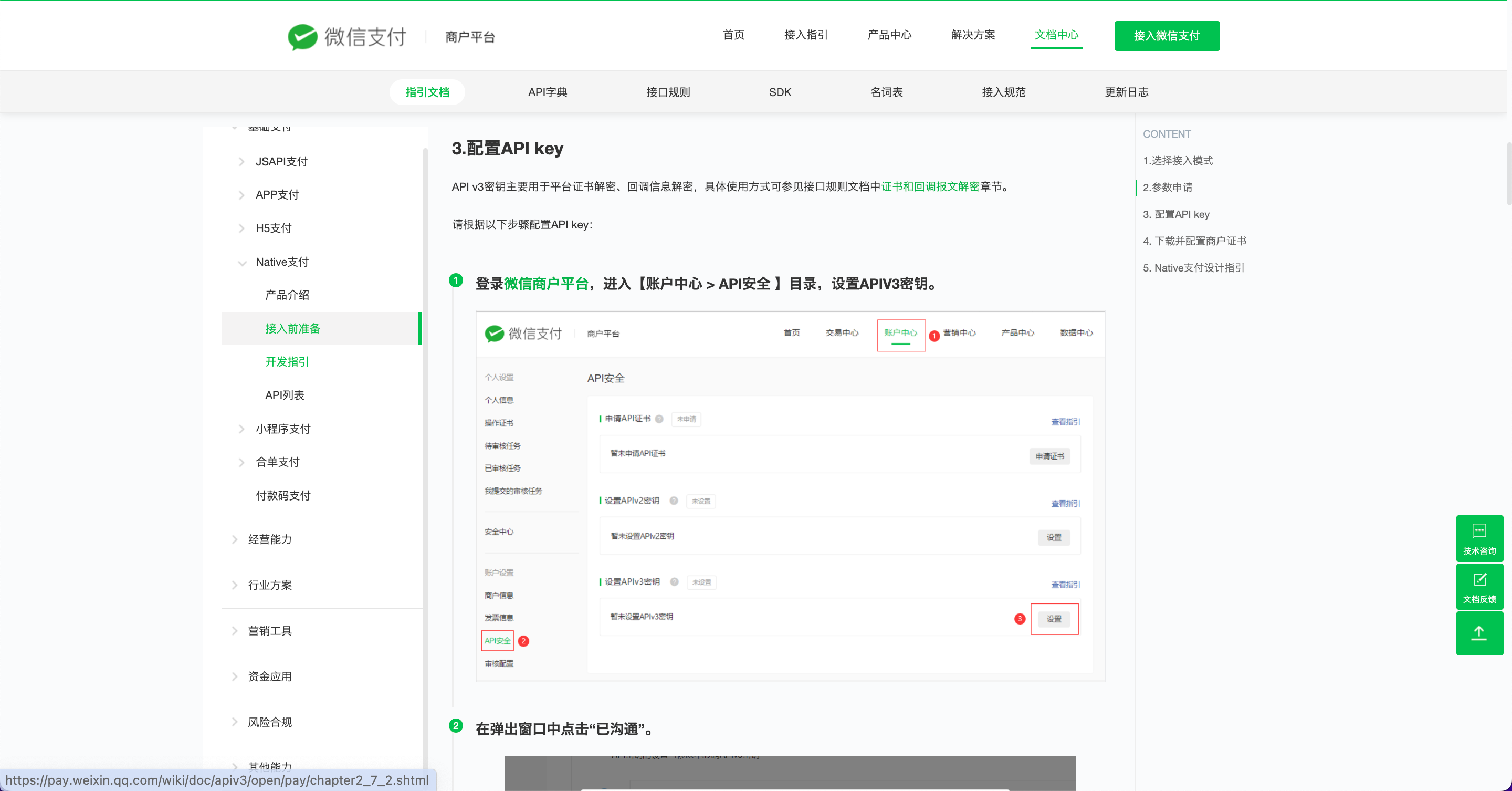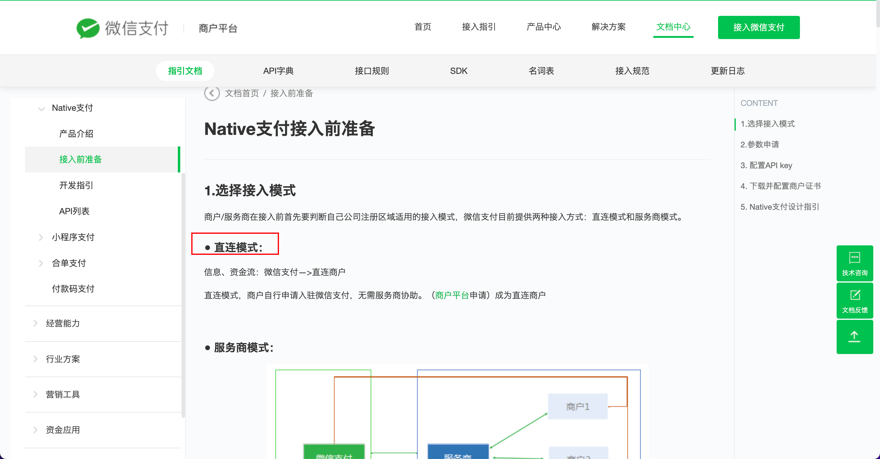 1.跳转访问 API 接口文档中的接入指引:https://pay.weixin.qq.com/wiki/doc/apiv3/open/pay/chapter2_7_1.shtml。注:对接微信支付的模式我们是选择直连模式。