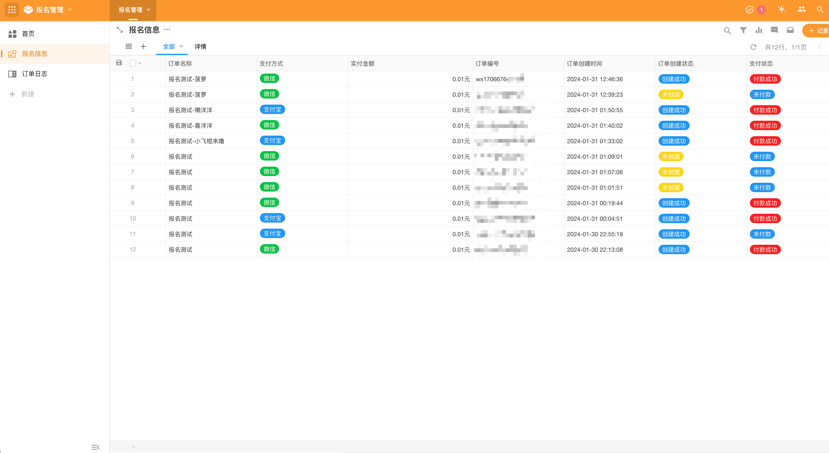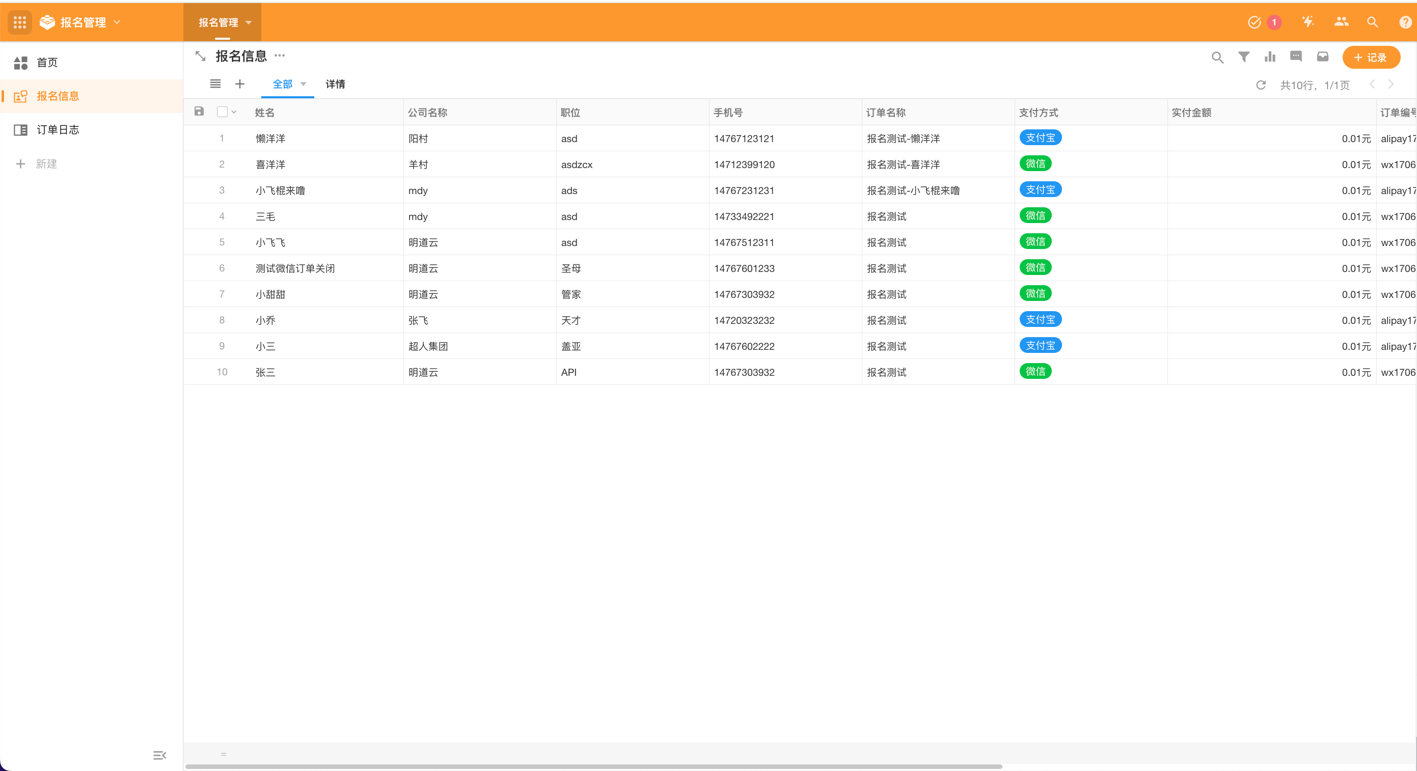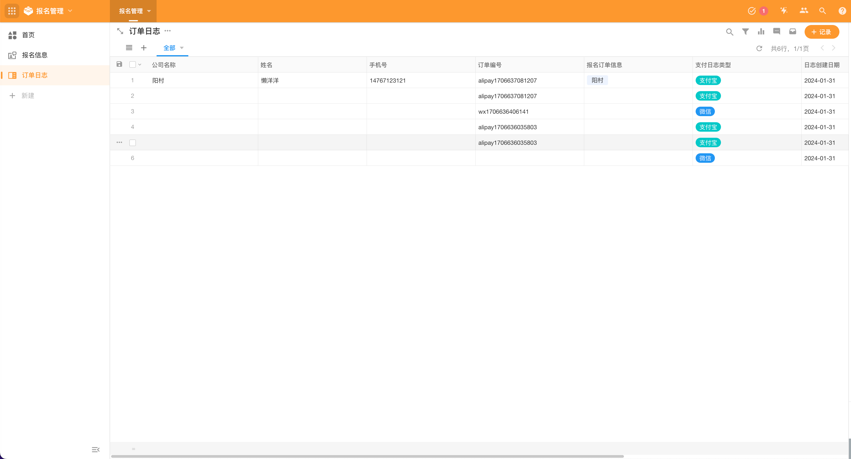 3)《订单日志》用于存储用户扫码支付后,存储支付宝以及微信支付推送过来的异步消息以及将报名信息关联上,可用于拓展其他业务。