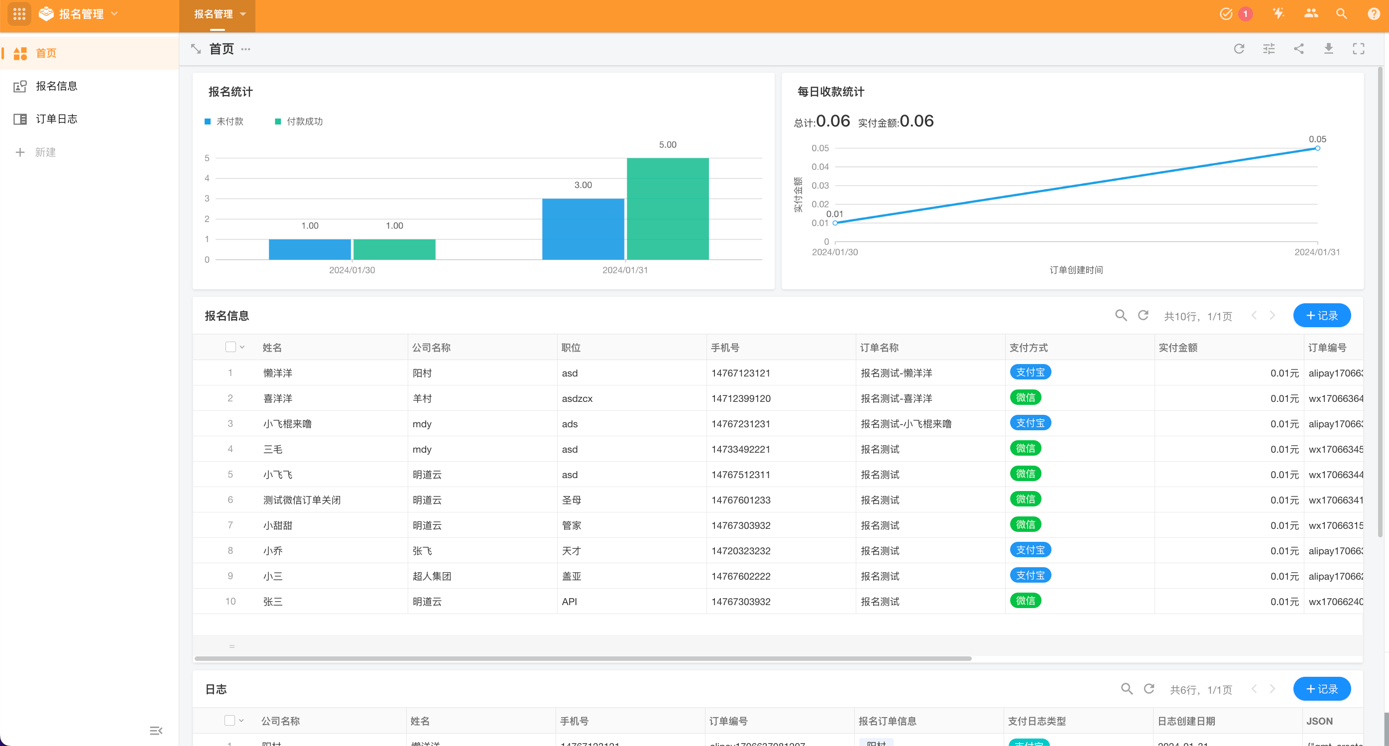 1)《首页》主要包含了报名人数统计图、每日收款金额统计。以及报名信息、订单日志视图嵌入
