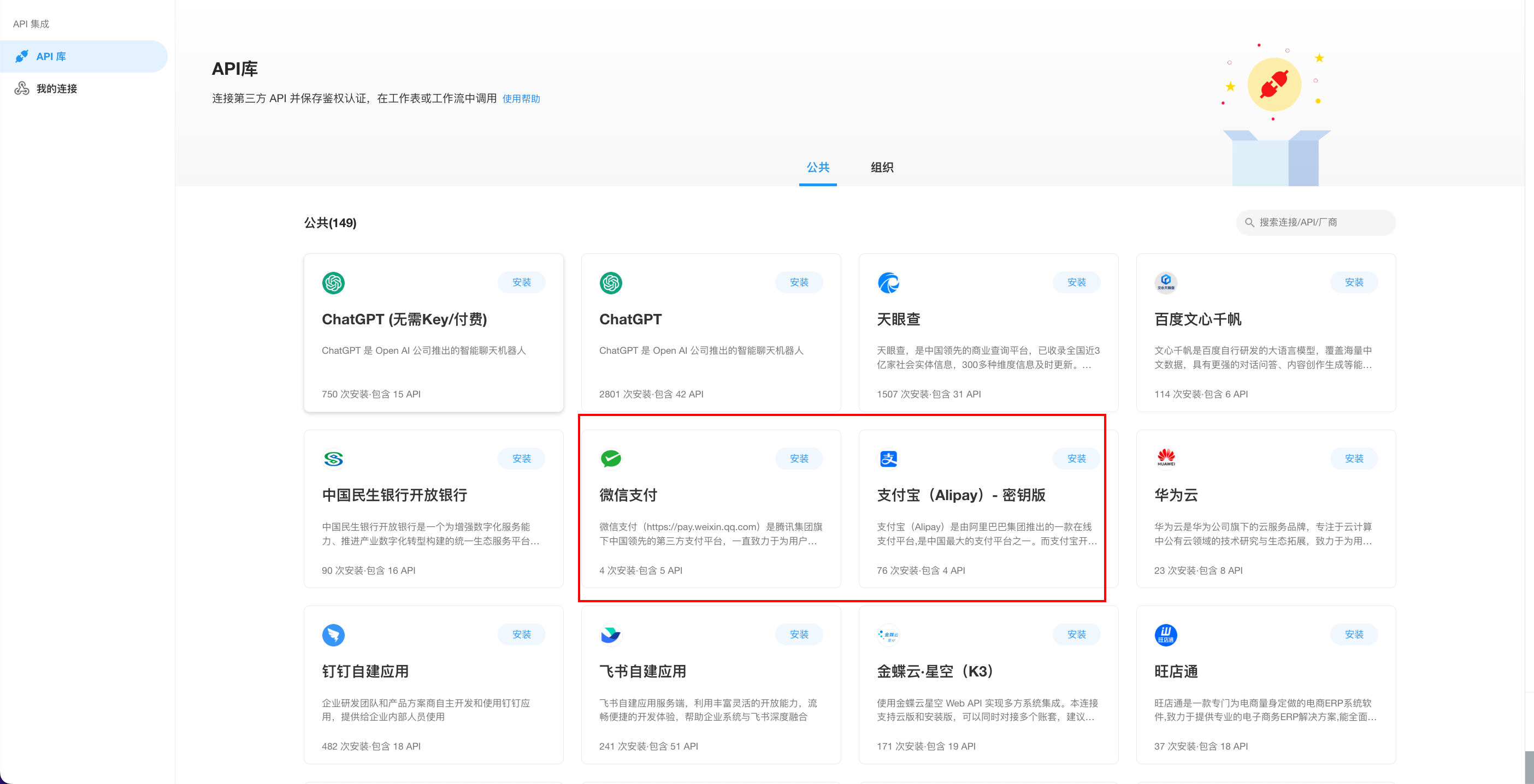 1. 在明道云集成中心现已上架微信支付、支付宝的相关支付管理接口,包含下单生成二维码、订单查询功能场景。用户可根据实际需求安装相关集成产品。