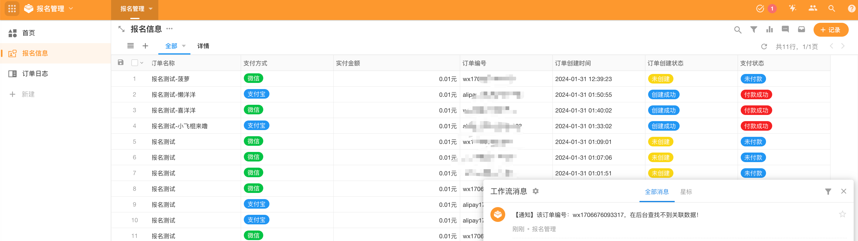 若用户支付提交但并未提交,则会通知到相关管理人员。如下: