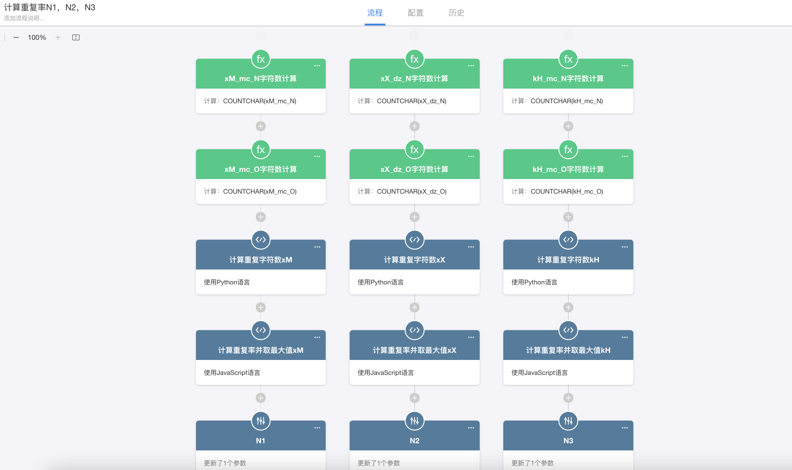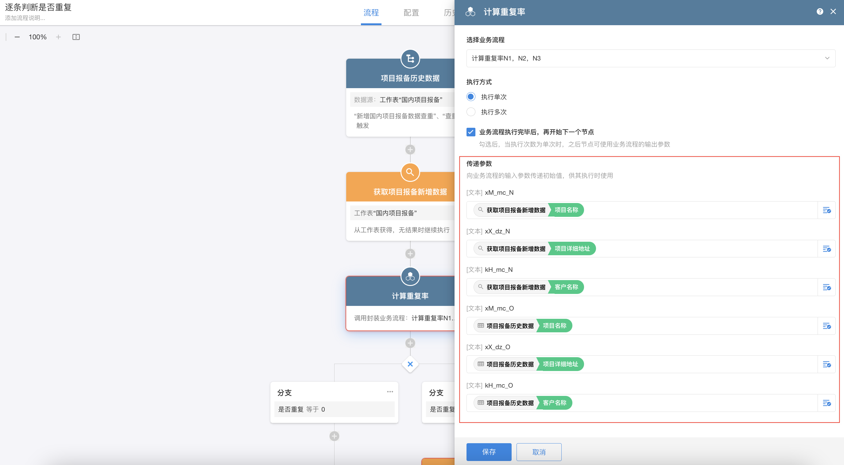 接下来,进入到子流程,按照给出的规则,我们首先要计算 N1、N2、N3。规则比较复杂,单独写到了一个封装业务流程中,也便于修改和重复调用。执行重复率计算之前,要将所需参数进行传递。这里分别按照需求中提到的三个字段,传递了新增记录及满足筛选条件的历史记录。