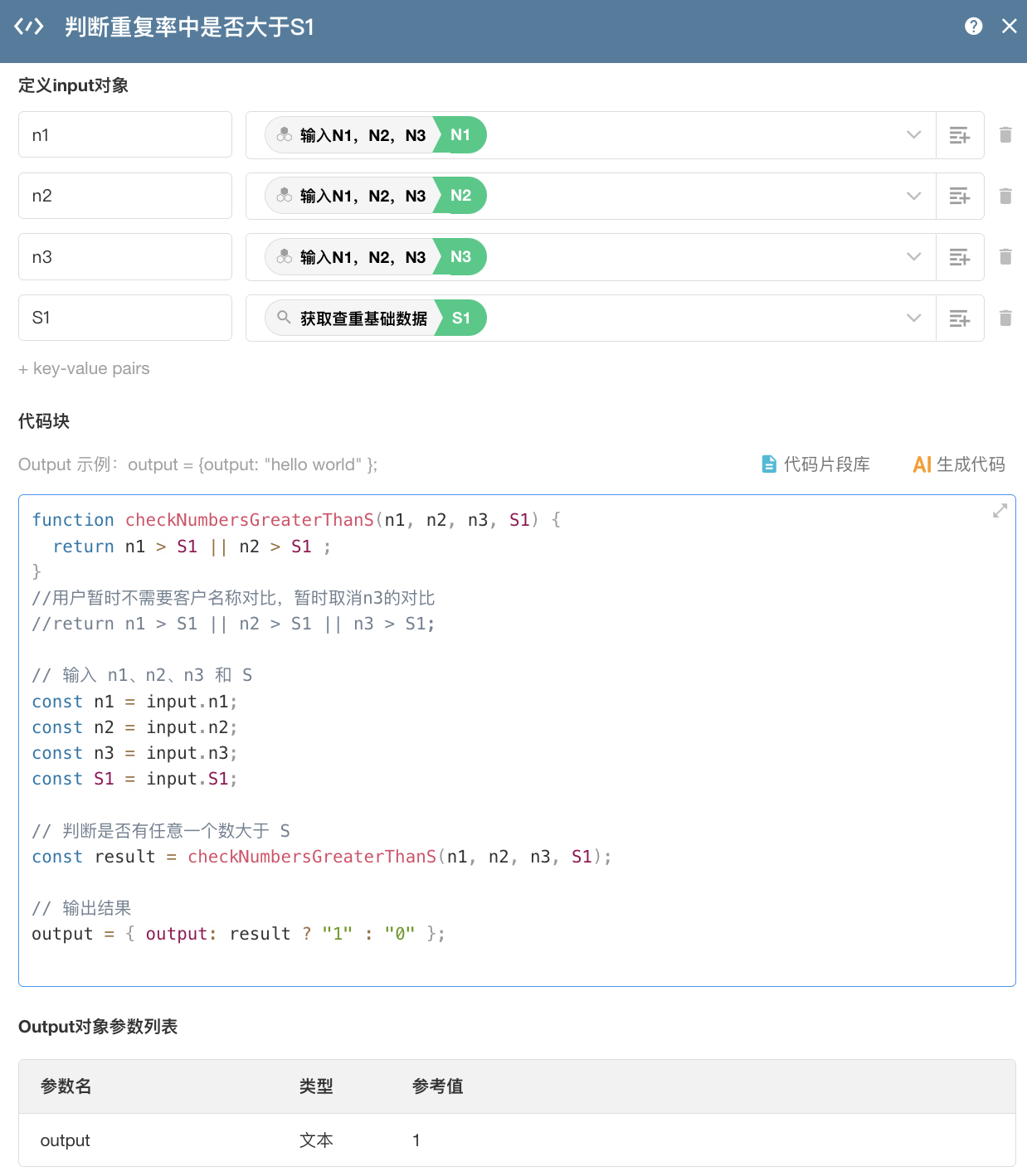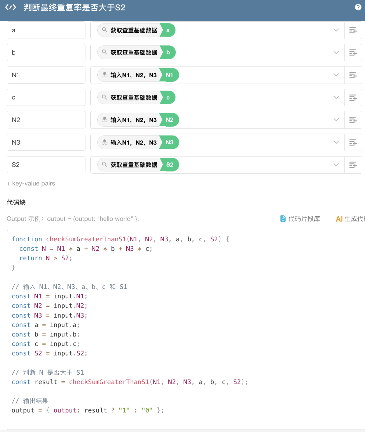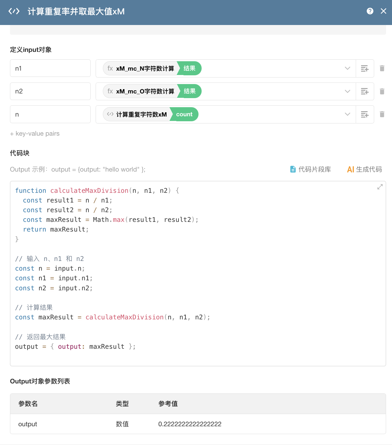 拿到重复字符数后,通过代码块计算,得出重复率,计为 N1。N2、N3 的计算逻辑同理。