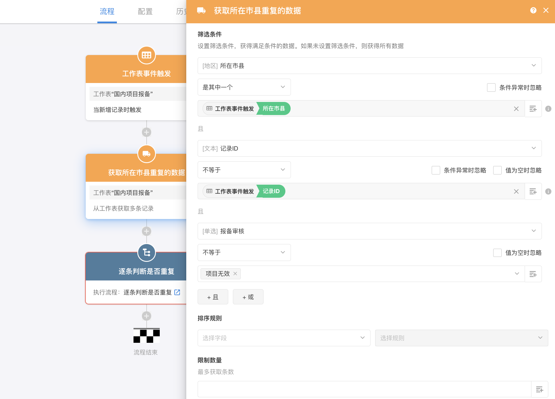 查重限制了范围:1、仅查重有效线索;2、查重范围控制在市县级;因此,在流程开始前,我们将查重获取的数据范围先进行缩小。这里有一点要注意,很多同学在做控制范围这一步,往往会遗漏掉当前触发数据,导致最终结果不准确,所以,这里我们加一个一项筛选条件,通过记录 ID 排除当前触发数据。