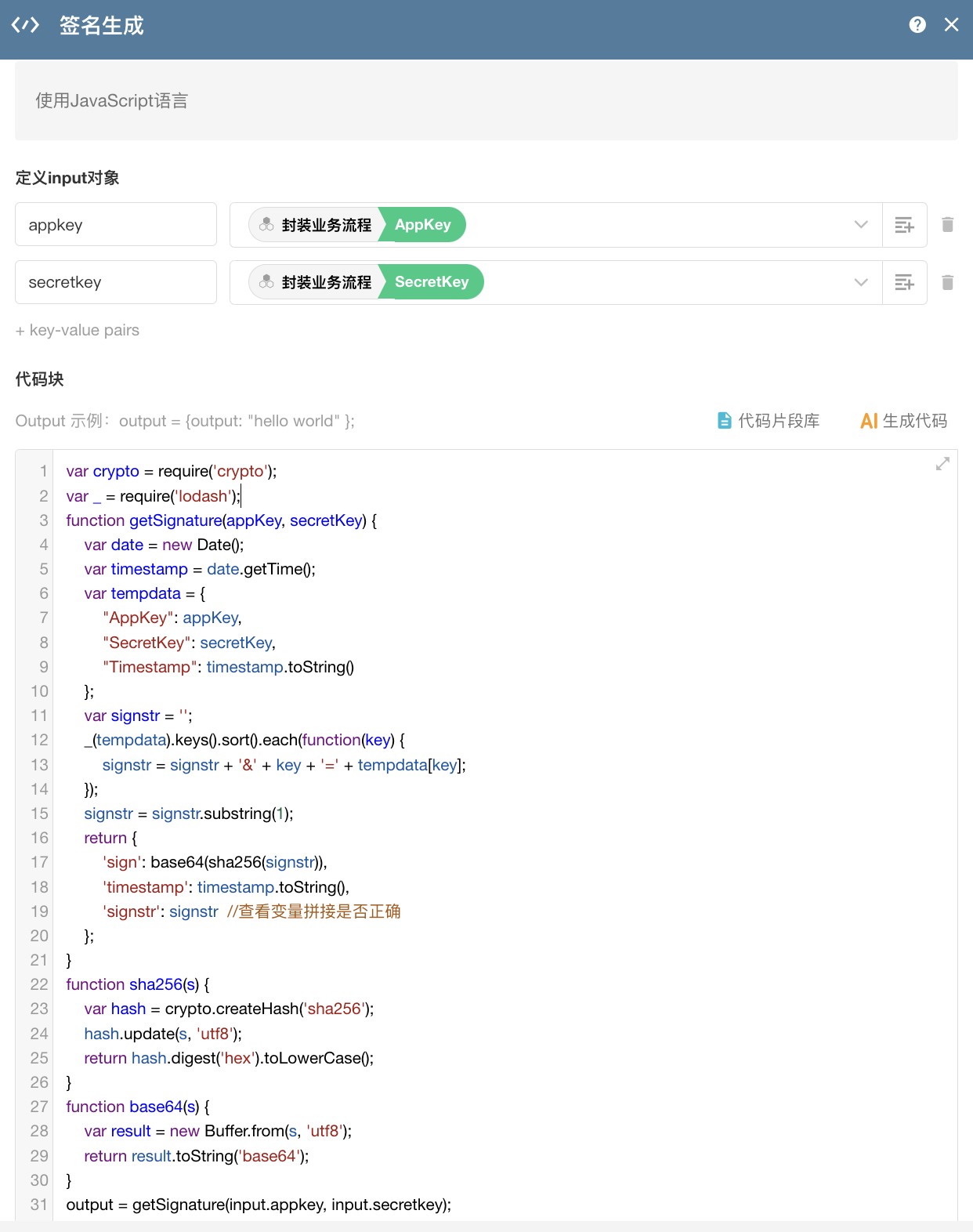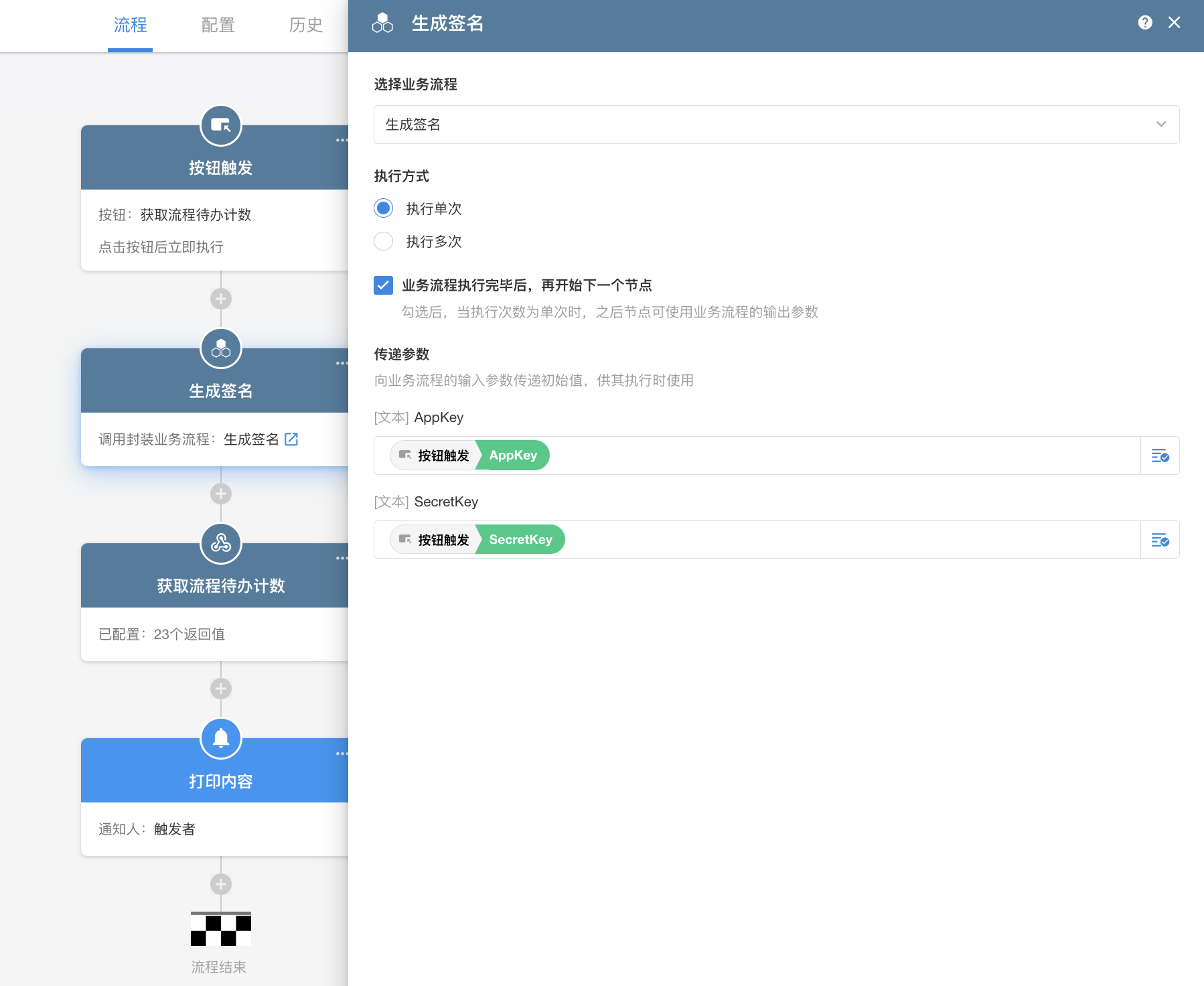 工作流中,首先调用封装业务流程获取到所需要的 timestamp、sign