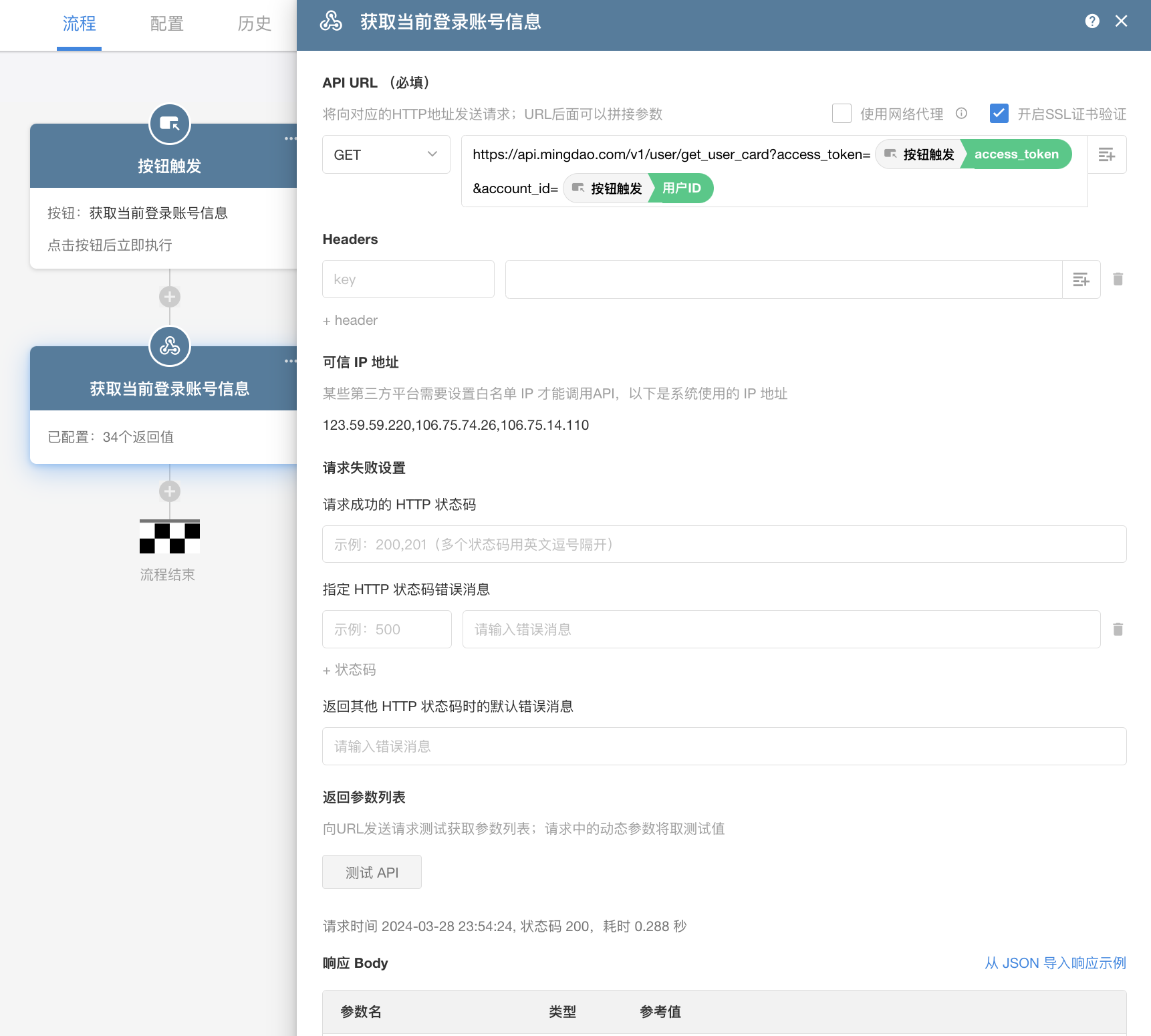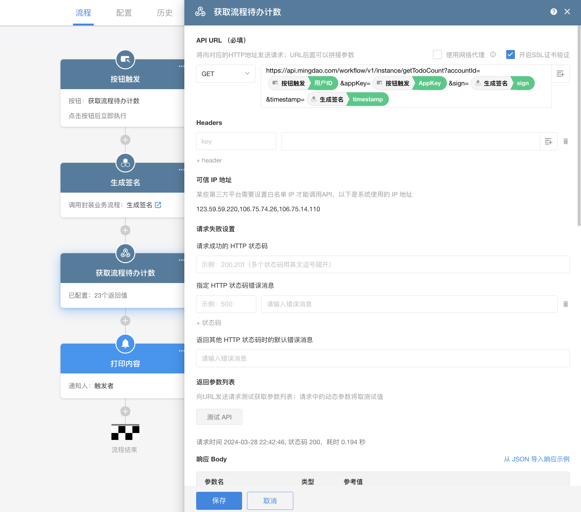 按照接口调用说明,拼接所需要的参数,这里用户 ID 可以实现通过工作流获取,由于用户 ID 基本上是不变的,拿到后可以固定存放起来。